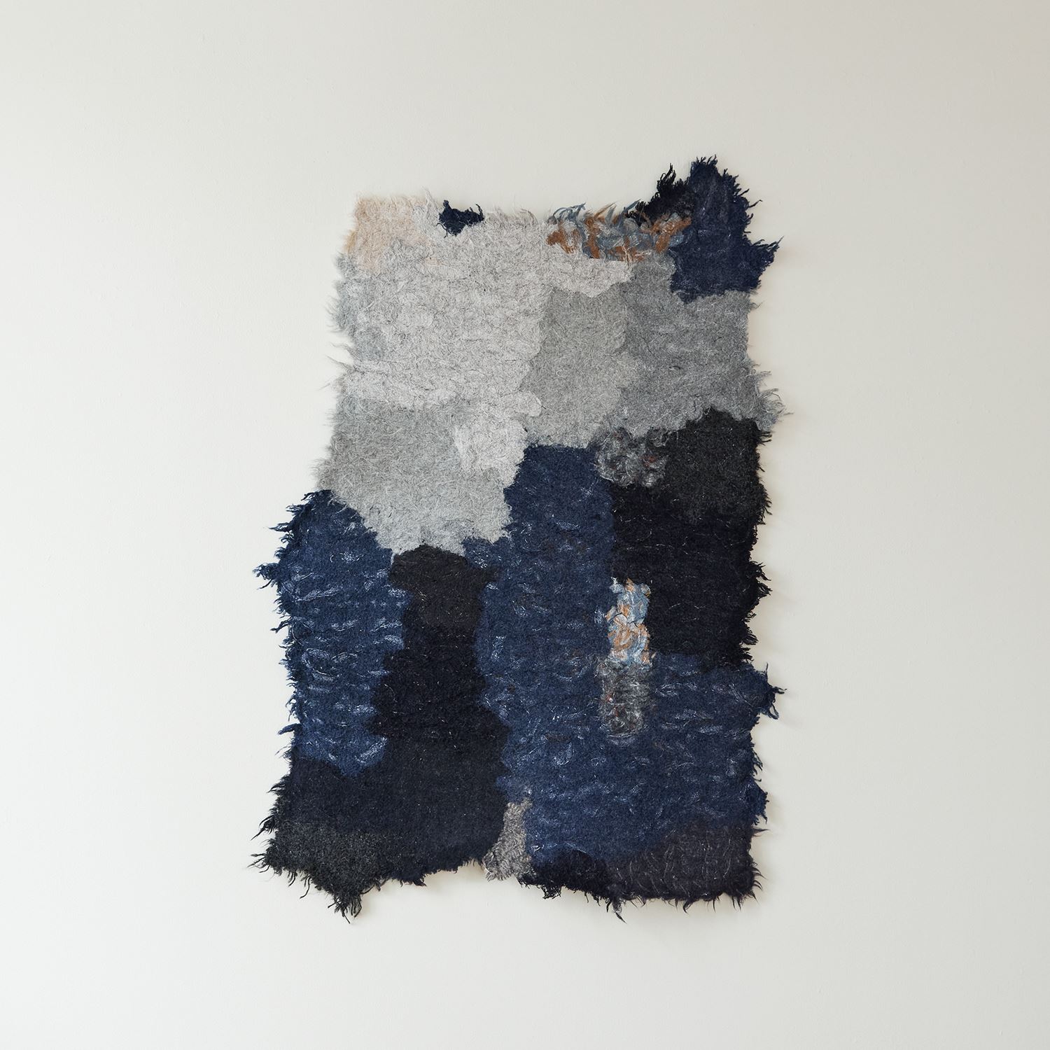 - この作品は、衣服やリビング用品に使われるウール生地を織る過程で発生する端材の リサイクル素材からつくられています。前提に、テキスタイルアート作品として制作 しており、ラグの用途を目的とした機能は備えておりません。
