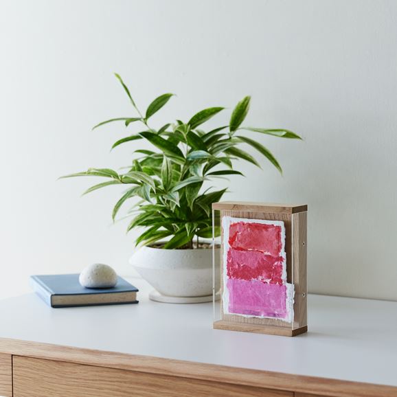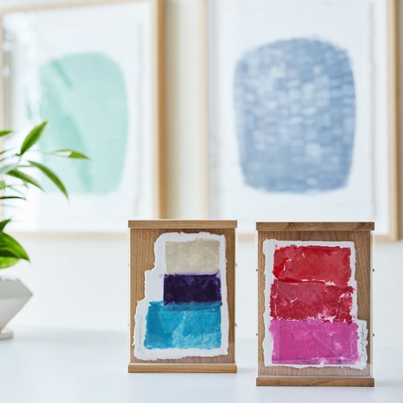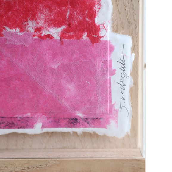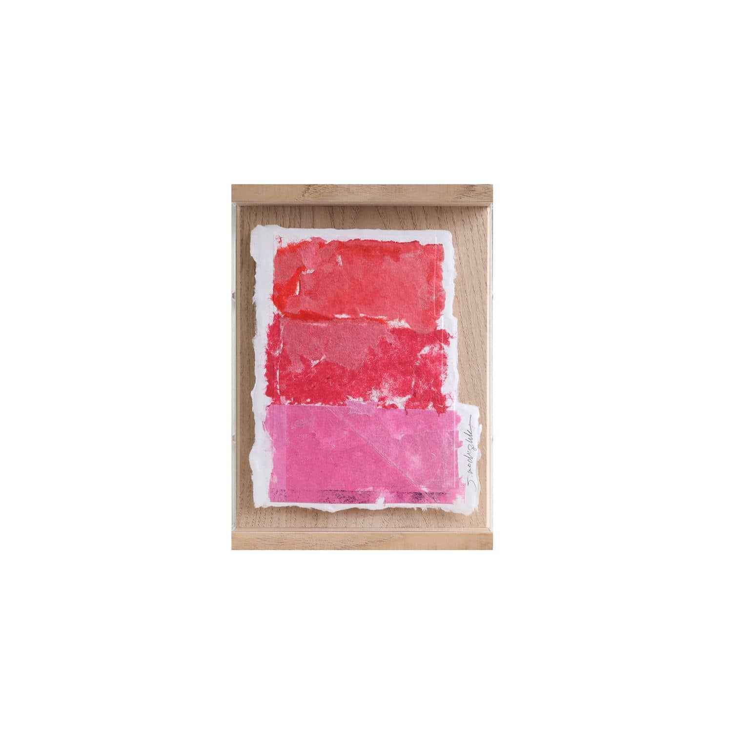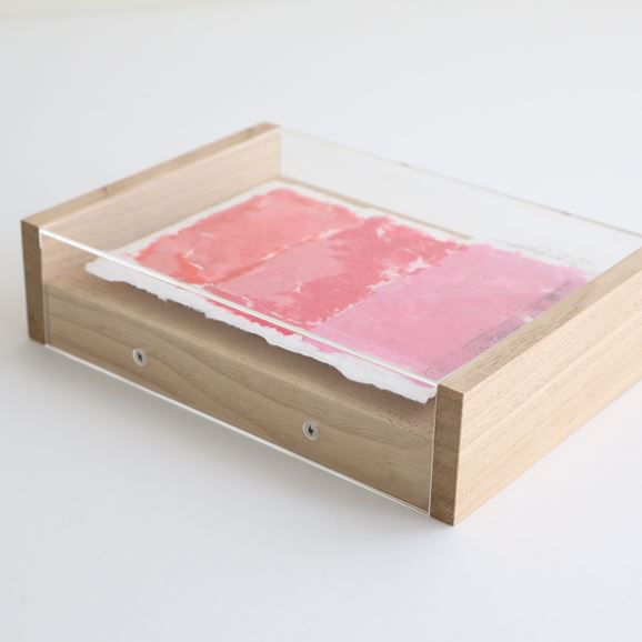 紙を、描くための支持体としてのみならず、それを描く側にも用いて表現をする「パルプアート」。紙の原料である楮やパルプなどを顔料インクで染め、型に流して成型、あるいはフリーハンドでカットして作られています。自然素材ゆえに着色や乾燥後の発色の具合がそのたびに異なり、二つとない作品が生まれます。モチーフは織物の模様や、雑多に置かれた本の山といった、望月さんの目に偶然留まった"何か"。無意識のうちに惹かれた"何か"をパルプの色や質感、かたちを通して表現しています。