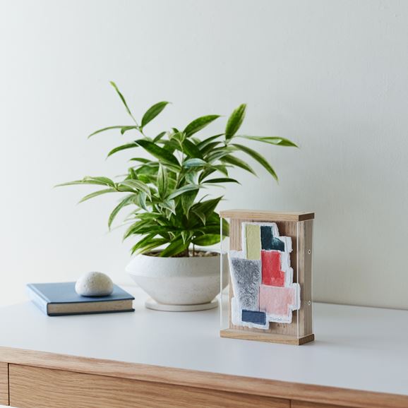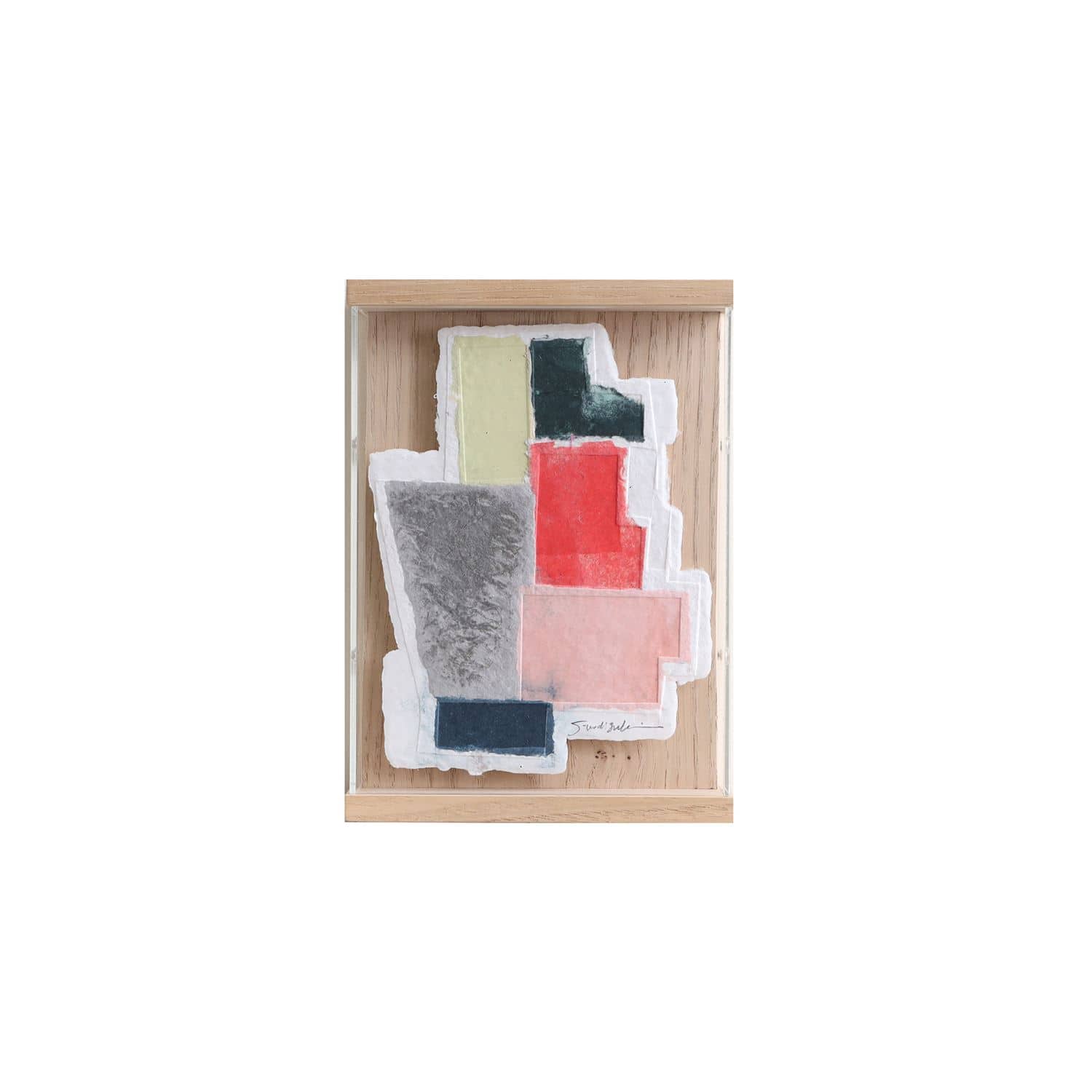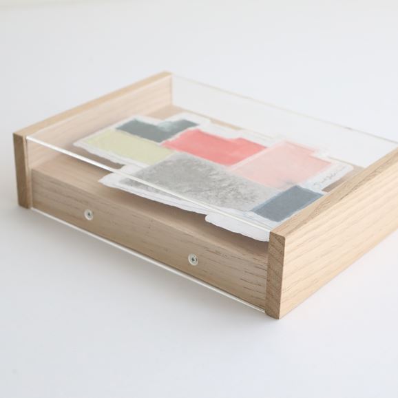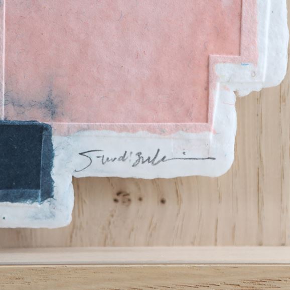 紙を、描くための支持体としてのみならず、それを描く側にも用いて表現をする「パルプアート」。紙の原料である楮やパルプなどを顔料インクで染め、型に流して成型、あるいはフリーハンドでカットして作られています。自然素材ゆえに着色や乾燥後の発色の具合がそのたびに異なり、二つとない作品が生まれます。モチーフは織物の模様や、雑多に置かれた本の山といった、望月さんの目に偶然留まった"何か"。無意識のうちに惹かれた"何か"をパルプの色や質感、かたちを通して表現しています。