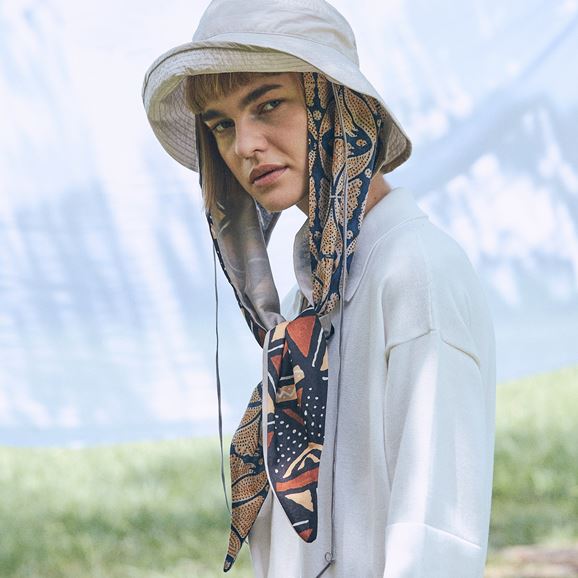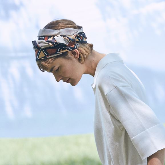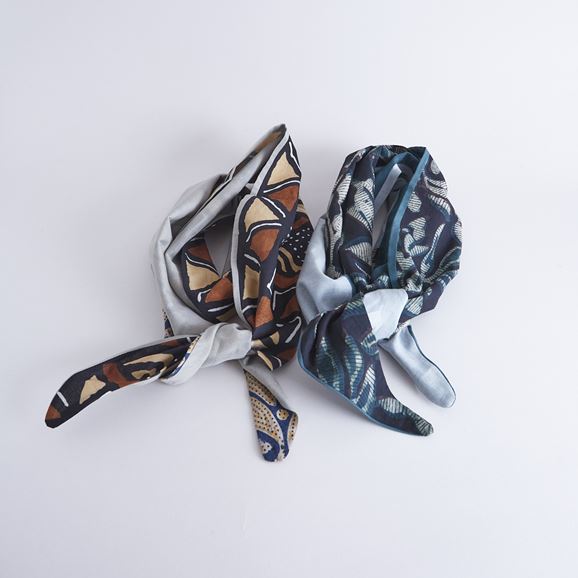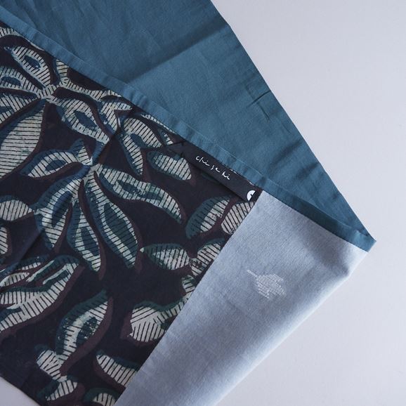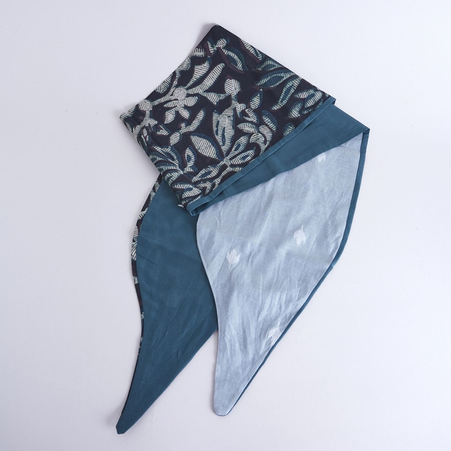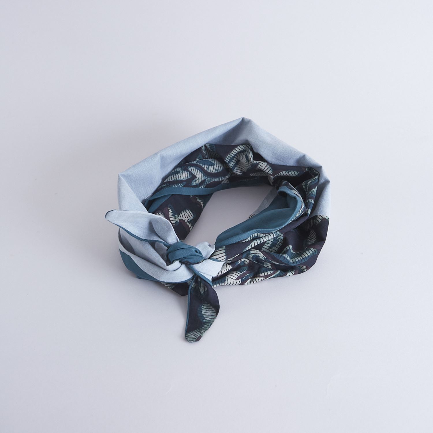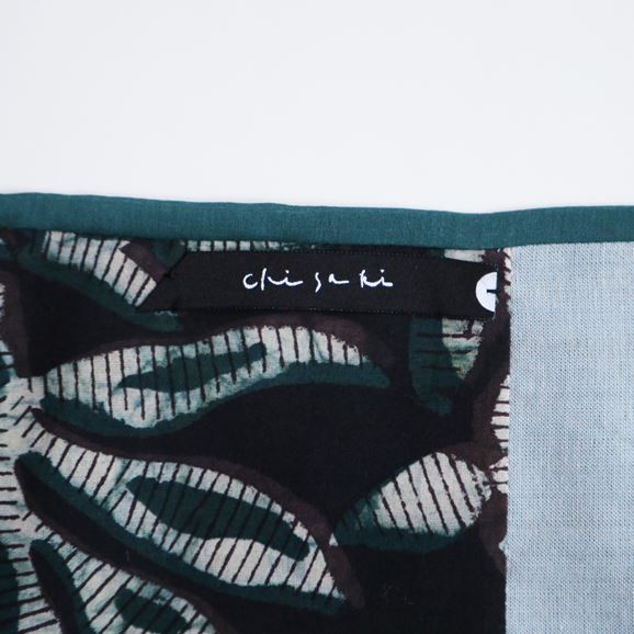 インドのブロックプリントの柄と無地部分に適度なシャリ感と軽やかさのあるコットンシルク素材を使用したchisaki定番のターバン。広めの幅は頭を大きく包んだり、ねじってポイントにしたり、結び目の位置を上にしたり下にしたりと使い方は自由自在です。スカーフのように首元に巻いてもスタイリングのアクセントになります。ニュアンスを表現するために異素材の組み合わせ、先の方のデザインを緩やかな流動形にすることで結びやすく垂らした時も美しくなるように配慮されています。