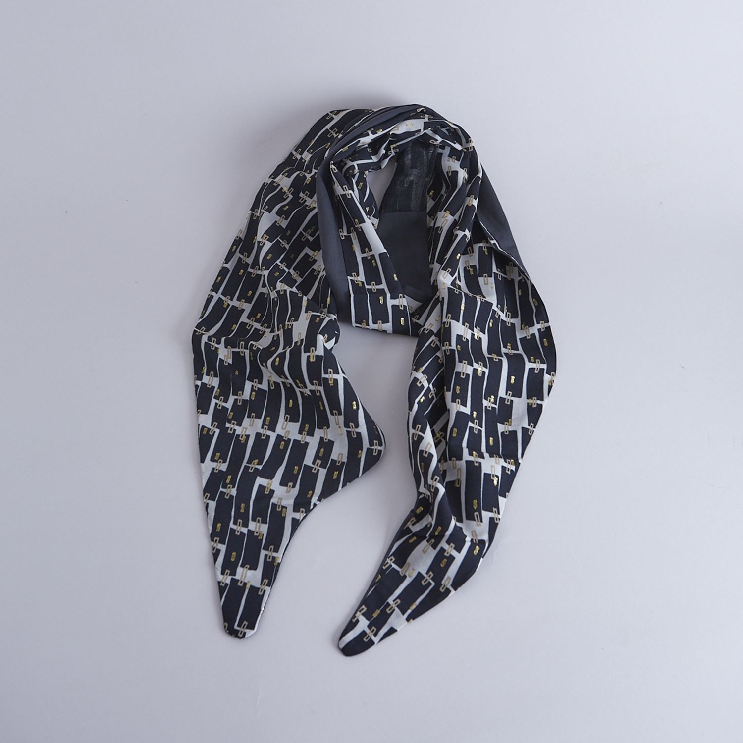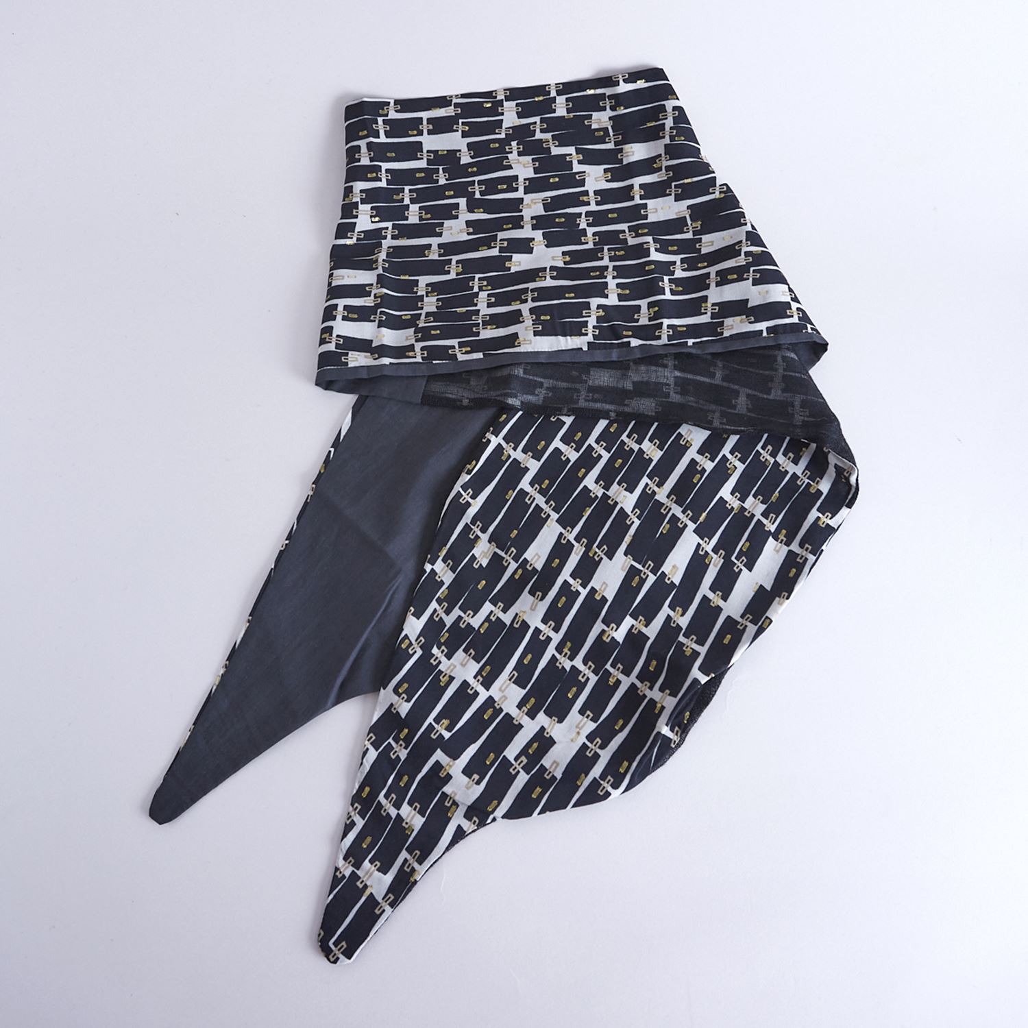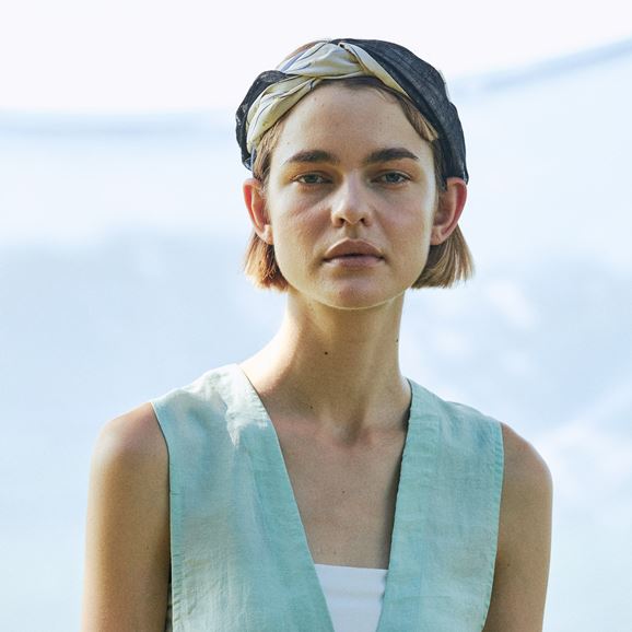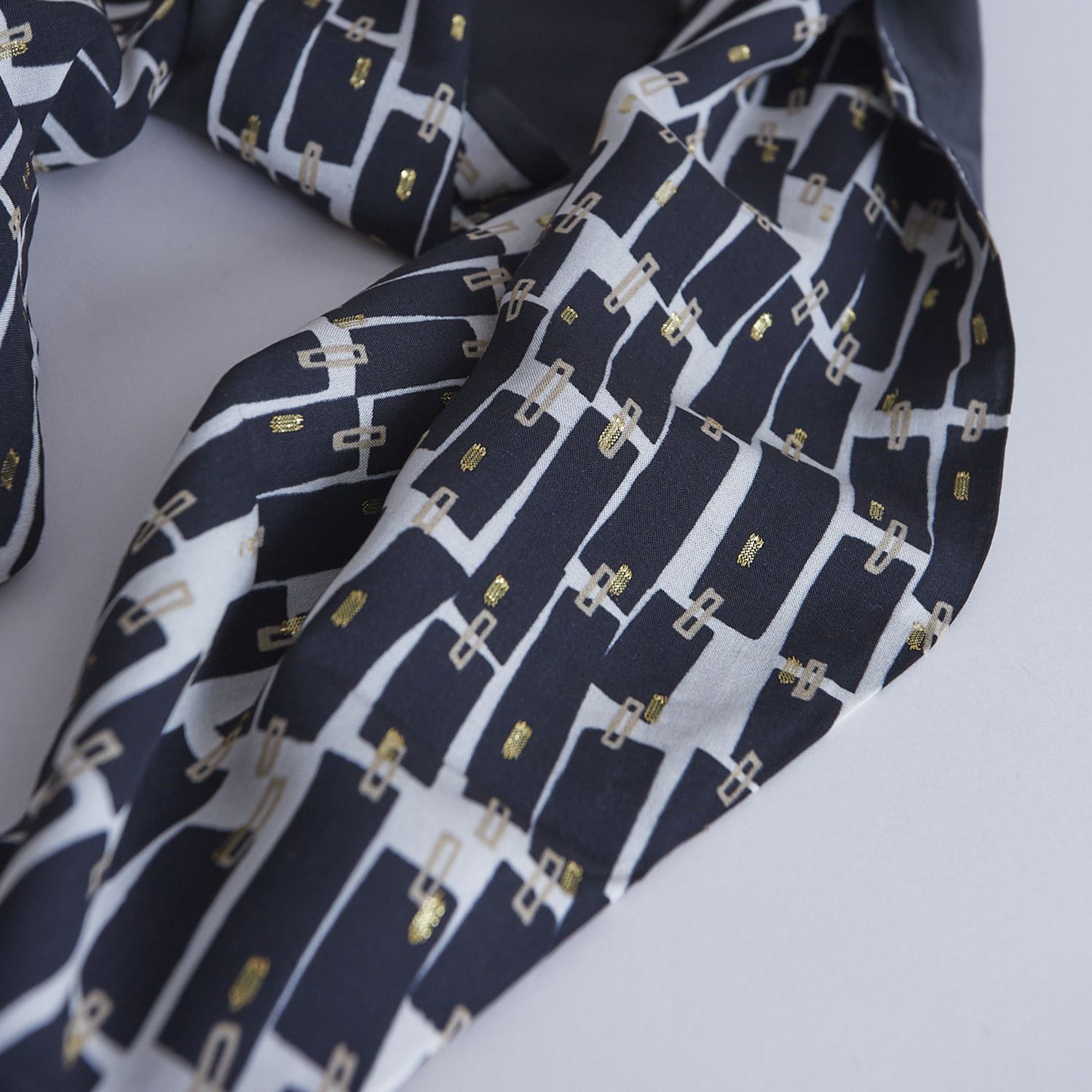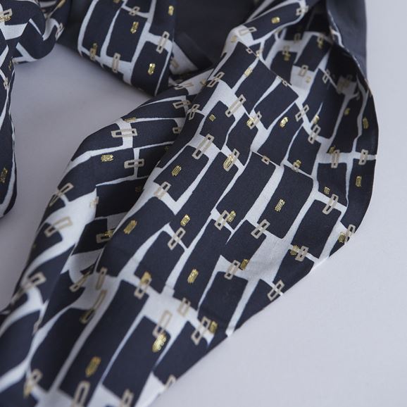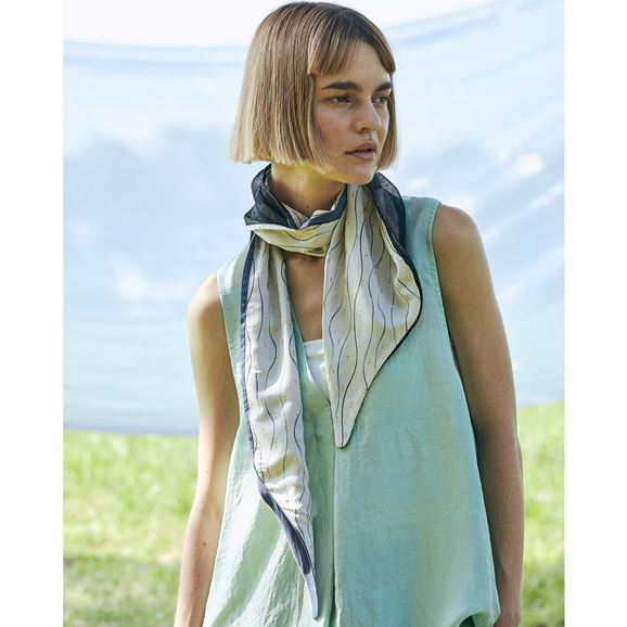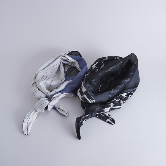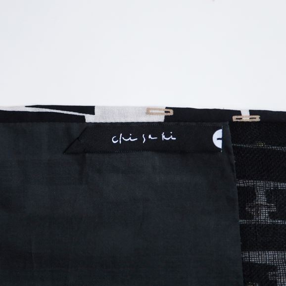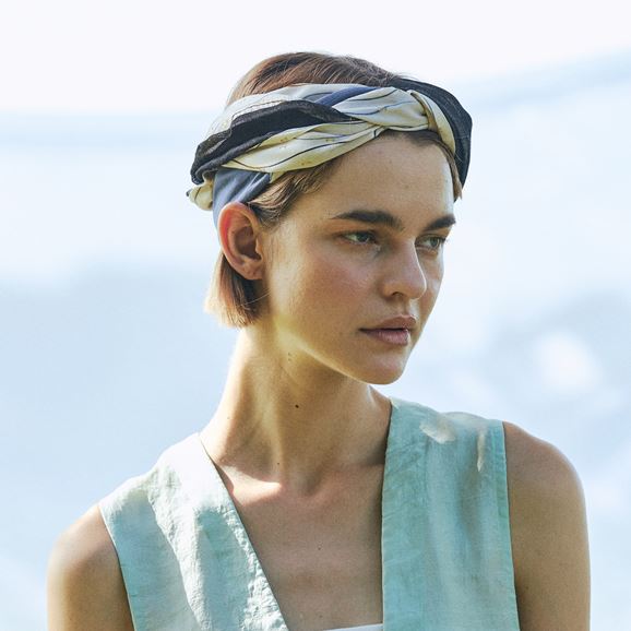 上品なレーヨンベースの柄生地に品のある滑り感のある無地の生地+細めのリネン糸を使用しさっくりと織り上げたリネン生地を使用したchisaki定番のターバン。広めの幅は頭を大きく包んだり、ねじってポイントにしたり結び目の位置を上にしたり下にしたりと使い方は自由自在です。スカーフのように首元に巻いてもスタイリングのアクセントとなります。ニュアンスを表現するために異素材の組み合わせ、先の?のデザインを緩やかな流動形にすることで結びやすく垂らした時も美しくなるように配慮されています。