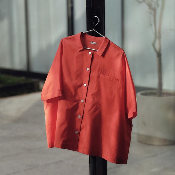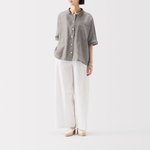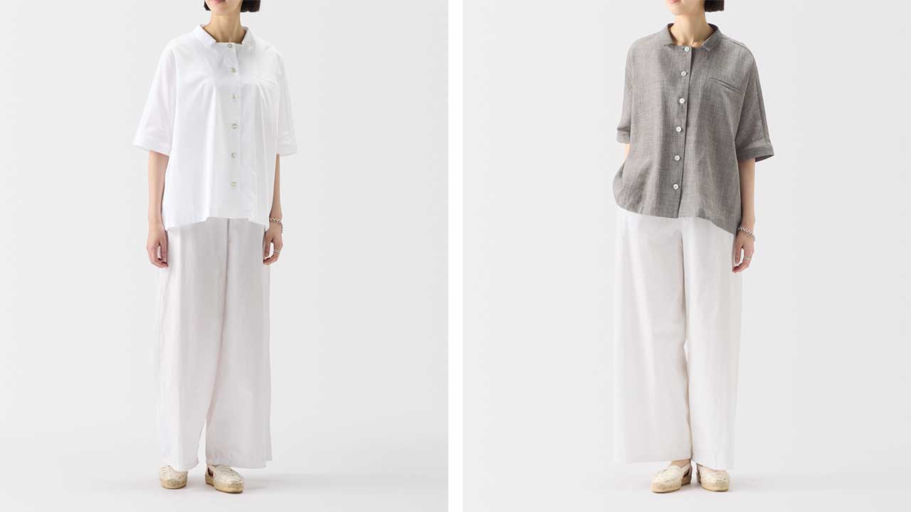 夏の日差しを受けてきらりと輝く大きめの貝ボタンが上品な印象を与えてくれます。ワイドパンツと合わせてゆったりと、リゾートシャツやタウンシャツとして着用いただけます。