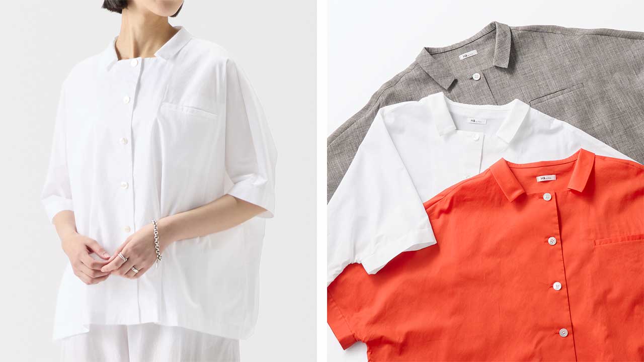 minä perhonen皆川明さん監修のもと、各地の生産現場で生まれた残反や残糸を活かして仕立てたイデーのウェアシリーズ「H& by POOL(ハンド バイ プール)」のワイドシャツ。