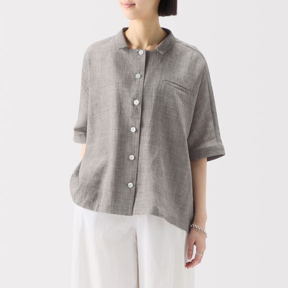 夏の日差しを受けてきらりと輝く大きめの貝ボタンが上品な印象を与えてくれます。ワイドパンツと合わせてゆったりと、リゾートシャツやタウンシャツとして着用いただけます。