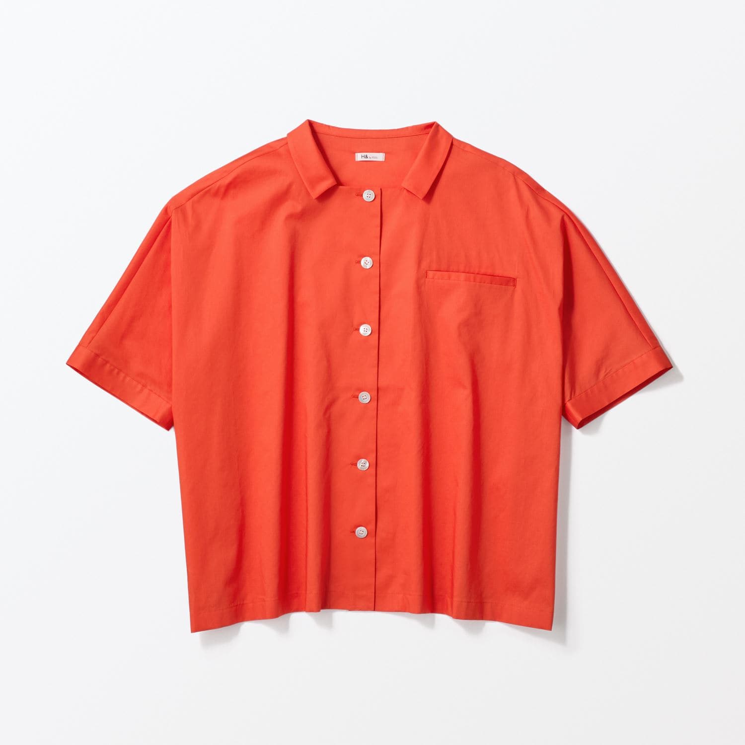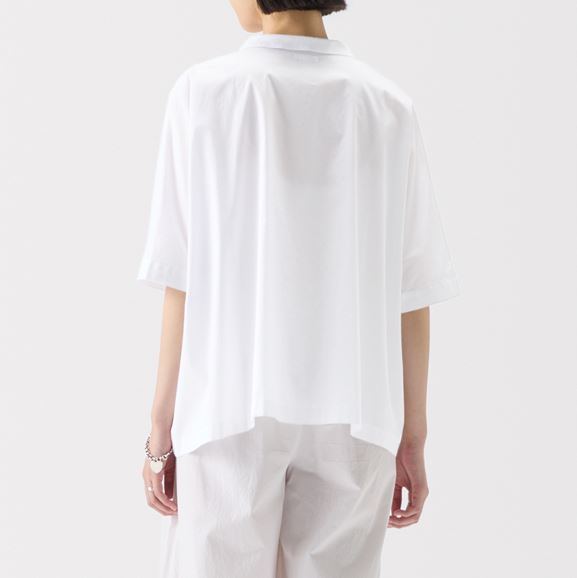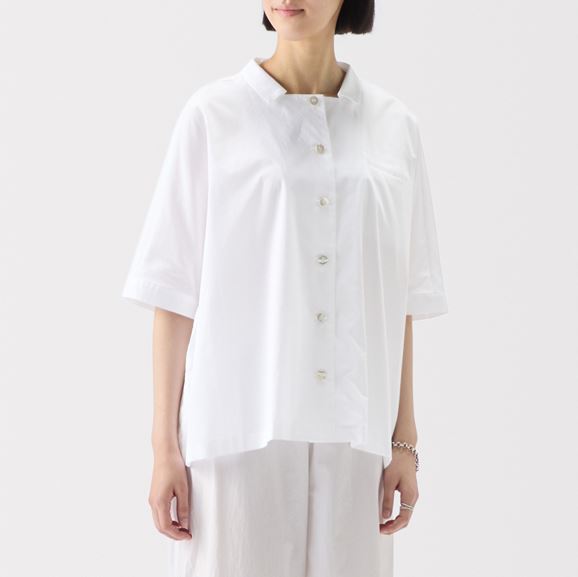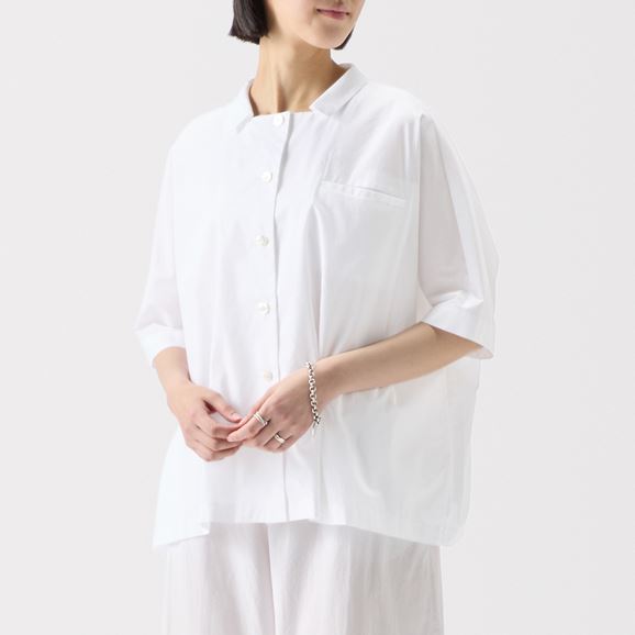 身幅をゆったりとったオーバーサイズのシャツです。こぶりな襟とスクエアにカットしたようなネックラインが印象的。ボタンをあけて羽織りものとしても活躍します。