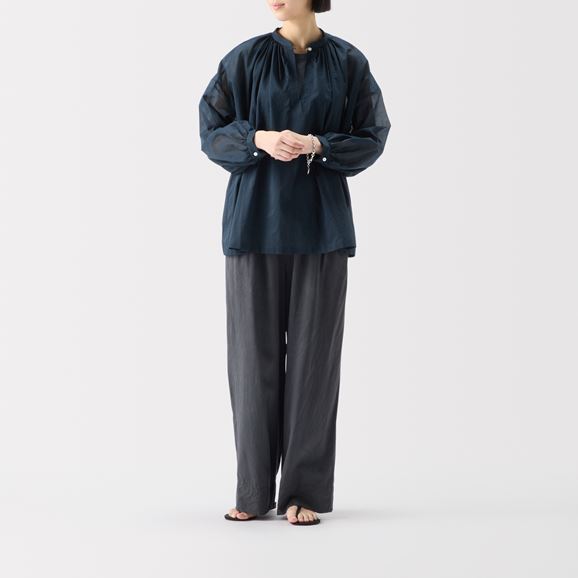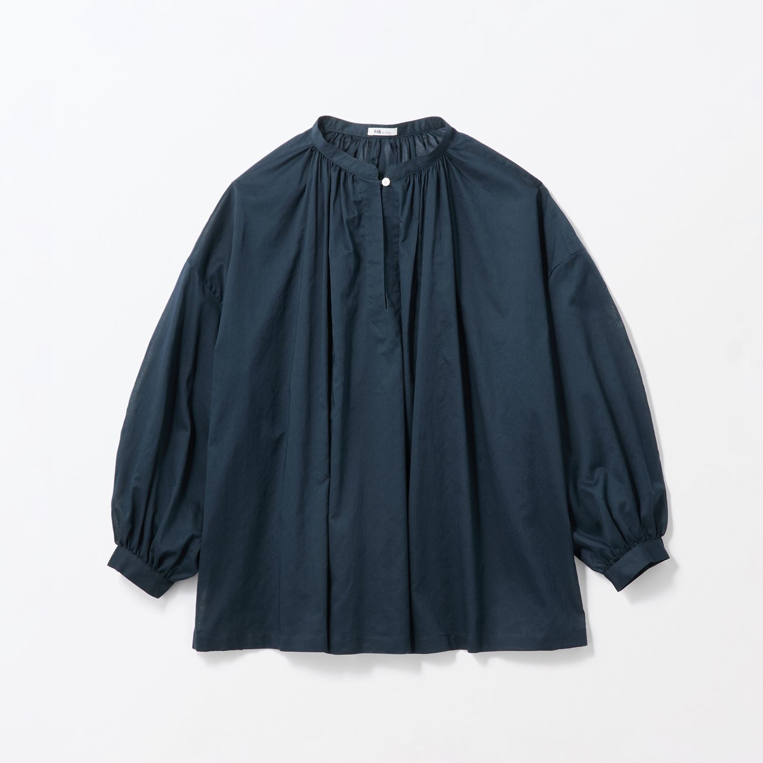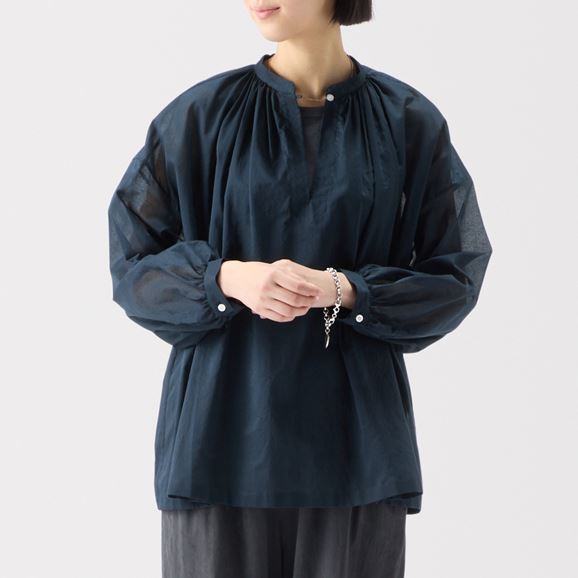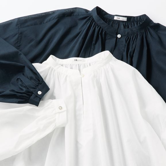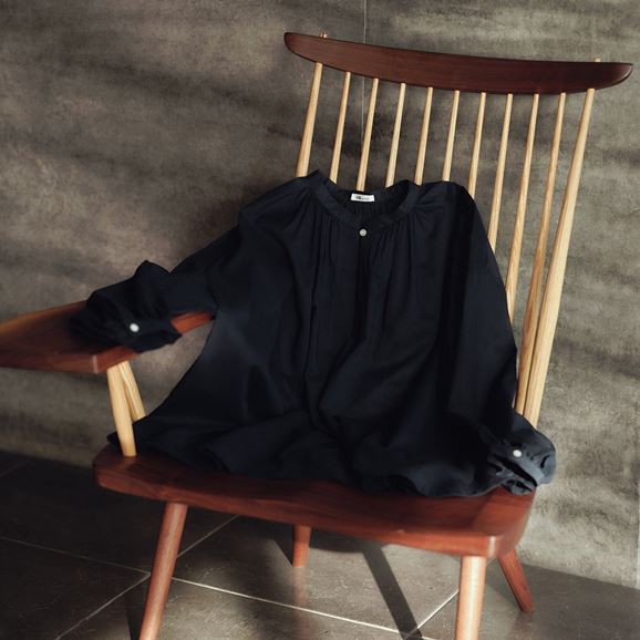 たっぷり入ったギャザーがふんわりとしたボリュームをつくり、優しい印象を与えます。襟元の小さなボタンがさりげないアクセントになっています。