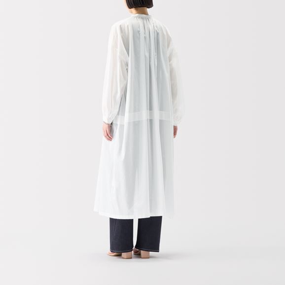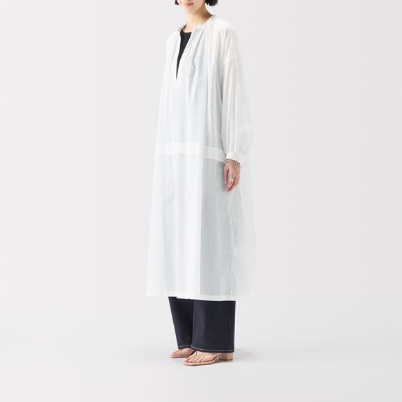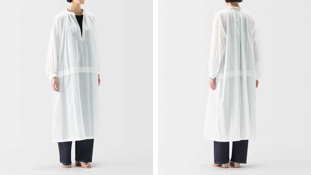 軽やかなシアー生地を使用した涼しげなワンピース。合わせるインナー次第で印象が変わり、春から秋口まで長く楽しめる万能アイテムです。