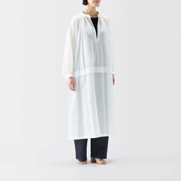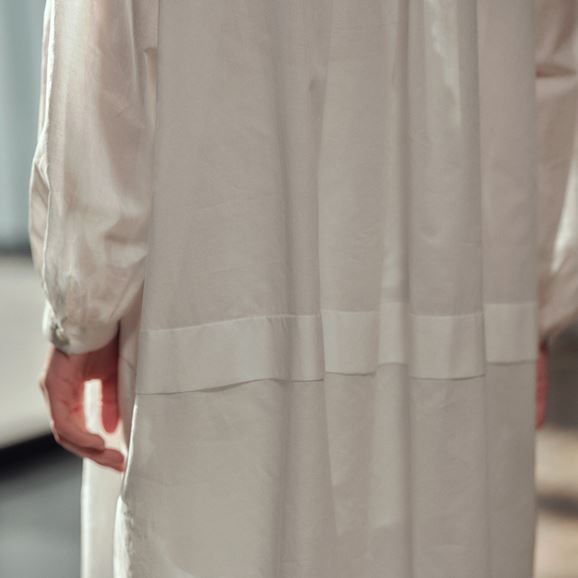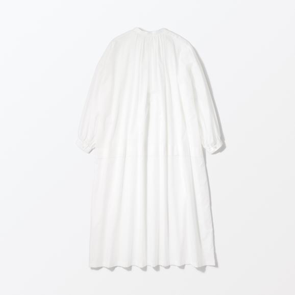 min&#228; perhonen皆川明さん監修のもと、各地の生産現場で生まれた残反や残糸を活かして仕立てたイデーのウェアシリーズ「H& by POOL(ハンド バイ プール)」のワンピース。<br>素材に向き合い、生産背景を大切にしながら、生産者とお客さまをつなぐ想いが込められた一着です。生産地で行き場をなくしていた生地を使用し作りました。<br>Off White:綿100%の細い糸で織り上げた柔らかく上質な生地。さらりとした肌触りが魅力です。<br><br><dl class="detail_image"><dt><img src="/images/item_page/hand/26ss/chr_op01.jpg" alt="" class="detailphoto"/></dt><dd class="detail_txt"><h5>小さなボタンが上品なアクセントに</h5><p>たっぷり入ったギャザーがふんわりとしたボリュームをつくり、優しい印象を与えます。襟元の小さなボタンがさりげないアクセントになっています。</p></dd></dl><dl class="detail_image mt40"><dt><img src="/images/item_page/hand/26ss/chr_op02.jpg" alt="" class="detailphoto"/></dt><dd class="detail_txt"><h5>シアーで愉しむレイヤードスタイル</h5><p>軽やかなシアー生地を使用した涼しげなワンピース。合わせるインナー次第で印象が変わり、春から秋口まで長く楽しめる万能アイテムです。</p></dd></dl><h6 class="mt20">コーディネートおすすめアイテム</h6><ul class="flex col4"><li><a href="/shop/g/g4547315976416/"><img src="/img/goods/12/4547315976416_org.jpg" alt="H& by POOL Denim Pants 34 Light Gray" class="detailphoto"><p class="itemName">H& by POOL Denim Pants 34 Light Gray</p></a></li><li><a href="/shop/g/g4550723208178/"><img src="/img/goods/12/4550723208178_org.jpg" alt="H& by POOL Wide Pants White" class="detailphoto"><p class="itemName">H& by POOL Wide Pants White</p></a></li><li><a href="/shop/g/g4550723208116/"><img src="/img/goods/12/4550723208116_org.jpg" alt="H& by POOL Pants Beige" class="detailphoto"><p class="itemName">H& by POOL Pants Beige</p></a></li><li><a href="/shop/g/g4550723291224/"><img src="/img/goods/12/4550723291224_org.jpg" alt="H& by POOL Cotton Cardigan Ivory" class="detailphoto"><p class="itemName">H& by POOL Cotton Cardigan Ivory</p></a></li></ul><h5 class="mt20">H& by POOLシリーズの全ラインナップはこちら</h5><a href="/shop/e/eHand/"><img src="/images/item_page_banner/itemPage_bnr_hand.jpg" alt="【特集】H& by POOL" class="itempagebnr"></a>