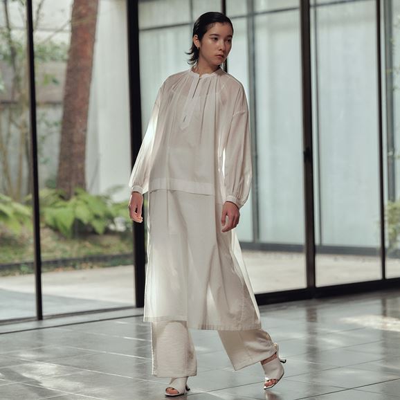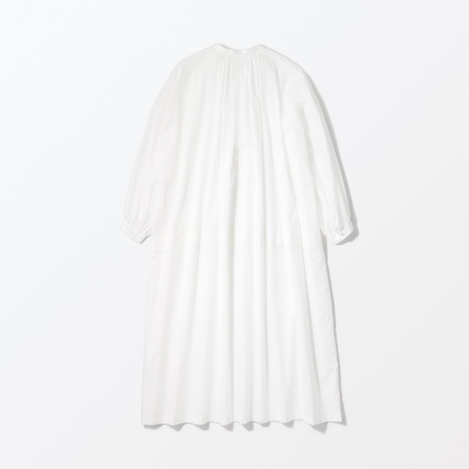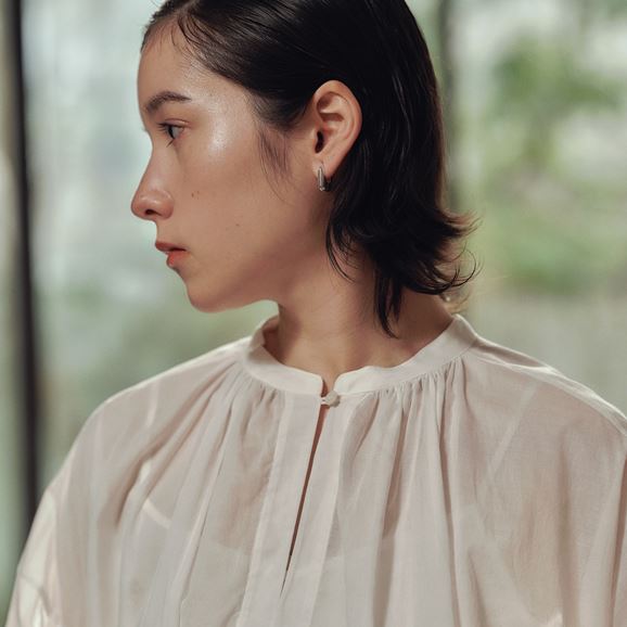 たっぷり入ったギャザーがふんわりとしたボリュームをつくり、優しい印象を与えます。襟元の小さなボタンがさりげないアクセントになっています。