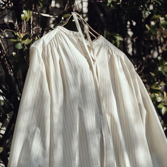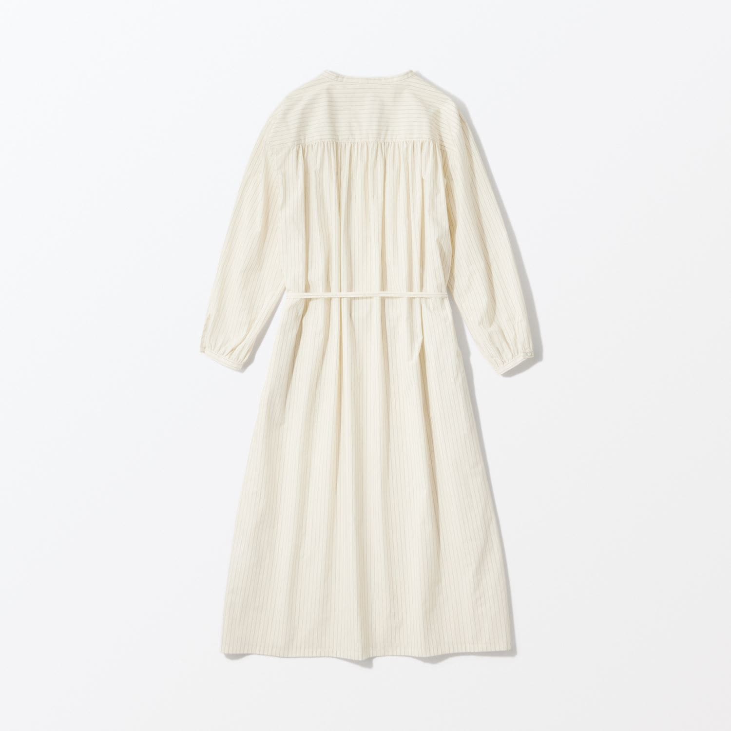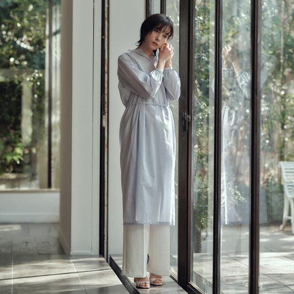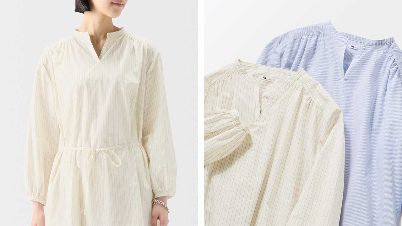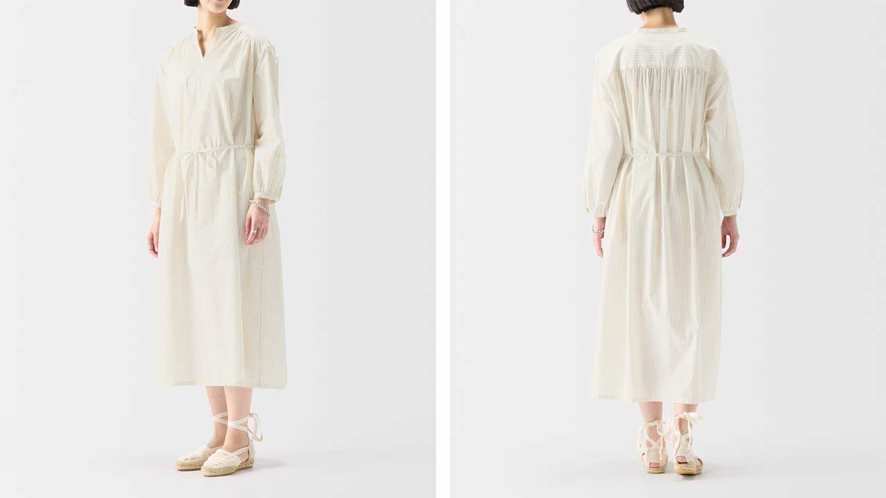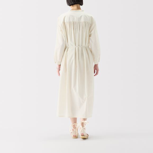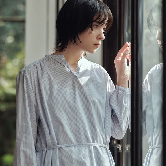 min&#228; perhonen皆川明さん監修のもと、各地の生産現場で生まれた残反や残糸を活かして仕立てたイデーのウェアシリーズ「H& by POOL(ハンド バイ プール)」のワンピース。<br>素材に向き合い、生産背景を大切にしながら、生産者とお客さまをつなぐ想いが込められた一着です。生産地で行き場をなくしていた生地を使用し作りました。<br>Off White:黄色味がかった薄手のシャツ生地。クリーンで上品な表情が魅力です。<br>Blue Stripe:細かいピッチのストライプ柄。軽やかで柔らかい手触りです。<br><dl class="detail_image"><dt><img src="/images/item_page/hand/26ss/op01.jpg" alt="" class="detailphoto"/></dt><dd class="detail_txt"><h5>ギャザーが柔らかい雰囲気を醸します</h5><p>ふんわりとしたシルエットが美しいワンピース。首元のカッティングとたっぷり入ったギャザーが柔らかい印象を与えます。</p></dd></dl> <dl class="detail_image mt40"><dt><img src="/images/item_page/hand/26ss/op02.jpg" alt="" class="detailphoto"/></dt><dd class="detail_txt"><h5>タウンユースはもちろん旅先での一枚にも◎</h5><p>シンプルながら一枚で様になるワンピース。前でリボンを結んですっきりと、ウエストの紐を外すとゆったりしたシルエットに。軽やかな着心地です。</p></dd></dl><h6 class="mt20">コーディネートおすすめアイテム</h6><ul class="flex col4"><li><a href="/shop/g/g4547315976416/"><img src="/img/goods/12/4547315976416_org.jpg" alt="H& by POOL Denim Pants 34 Light Gray" class="detailphoto"><p class="itemName">H& by POOL Denim Pants 34 Light Gray</p></a></li><li><a href="/shop/g/g4550723208178/"><img src="/img/goods/12/4550723208178_org.jpg" alt="H& by POOL Wide Pants White" class="detailphoto"><p class="itemName">H& by POOL Wide Pants White</p></a></li><li><a href="/shop/g/g4550723208116/"><img src="/img/goods/12/4550723208116_org.jpg" alt="H& by POOL Pants Beige" class="detailphoto"><p class="itemName">H& by POOL Pants Beige</p></a></li><li><a href="/shop/g/g4550723291224/"><img src="/img/goods/12/4550723291224_org.jpg" alt="H& by POOL Cotton Cardigan Ivory" class="detailphoto"><p class="itemName">H& by POOL Cotton Cardigan Ivory</p></a></li></ul><h5 class="mt20">H& by POOLシリーズの全ラインナップはこちら</h5><a href="/shop/e/eHand/"><img src="/images/item_page_banner/itemPage_bnr_hand.jpg" alt="【特集】H& by POOL" class="itempagebnr"></a>