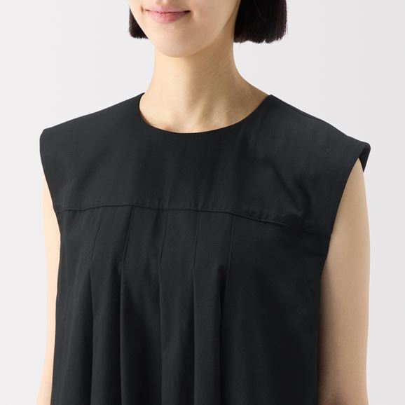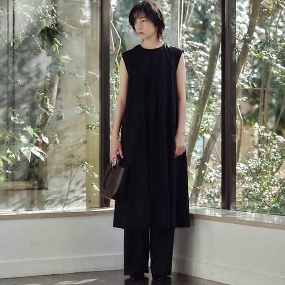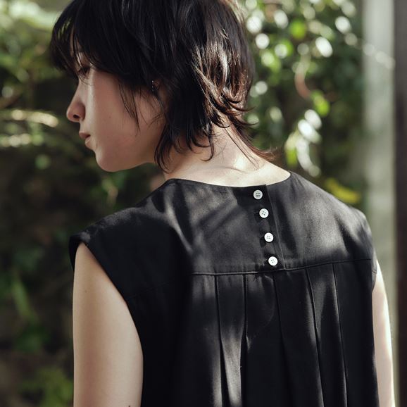 胸元の細かなギャザーやタックが縦のラインを強調しスタイルアップします。後ろ姿はボタンとギャザーがアクセントに。ゆったりとしたシルエットで身体の線を拾いません。