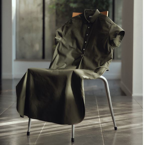 素材に向き合い、生産背景を大切にしながら、生産者とお客さまをつなぐ想いが込められた一着です。生産地で行き場をなくしていた生地を使用し作りました。