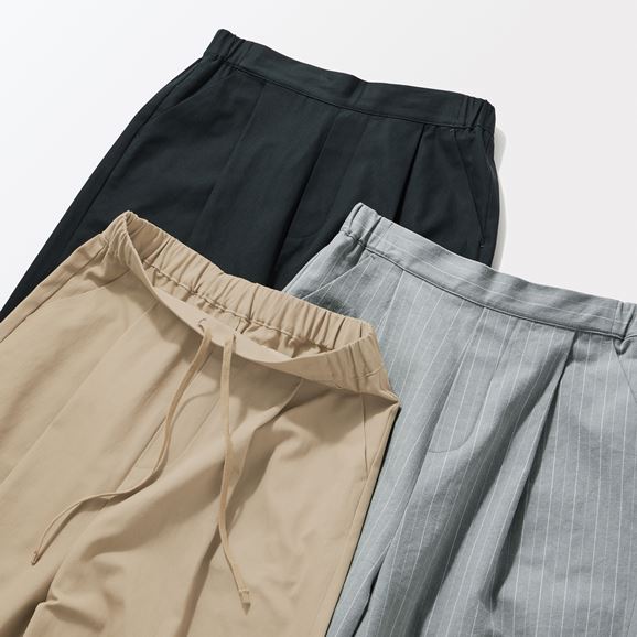 股上が深くリラックスした着心地です。ゆったりしたシルエットですが、短めの丈ですっきり見えるデザインです。 ウエストは内側の紐で調整でき背面にはゴムが入っているため、ストレスフリーな着心地です。ウエスト周りがすっきりとした印象になります。
