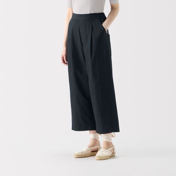 トップスをインすることで、ウエスト位置が高く見え脚長効果があります。 足首が見えることで軽やかな印象に。同素材でのスリーブレスベストとセットアップもおすすめです。