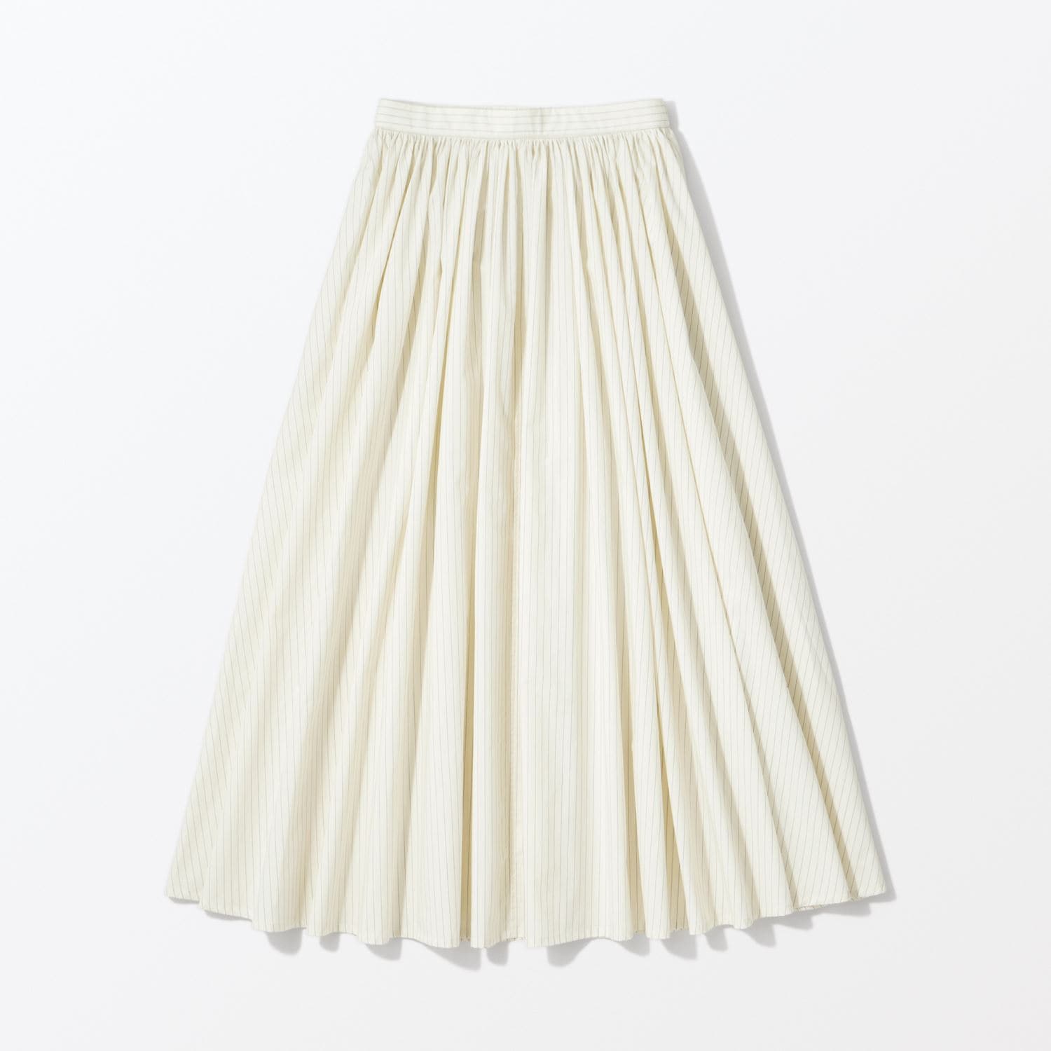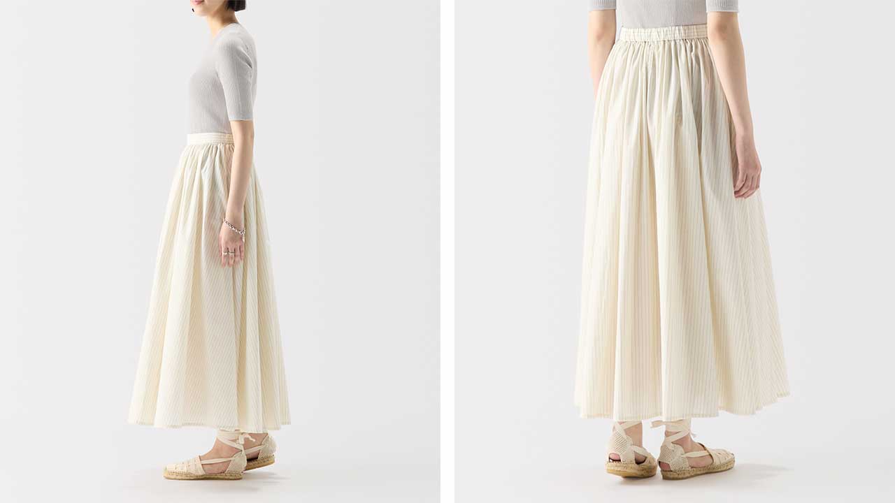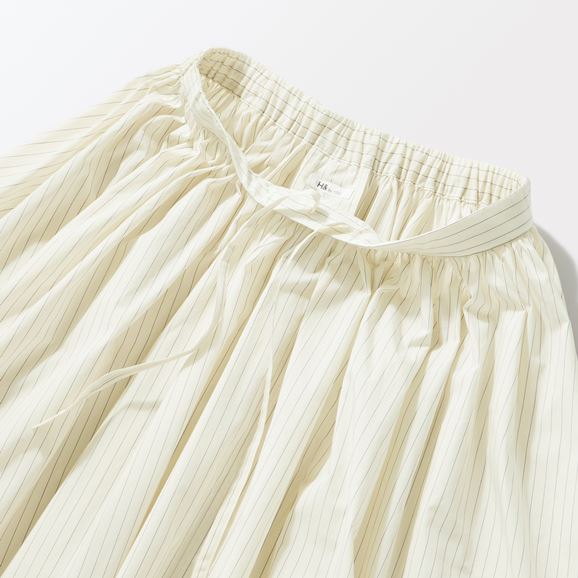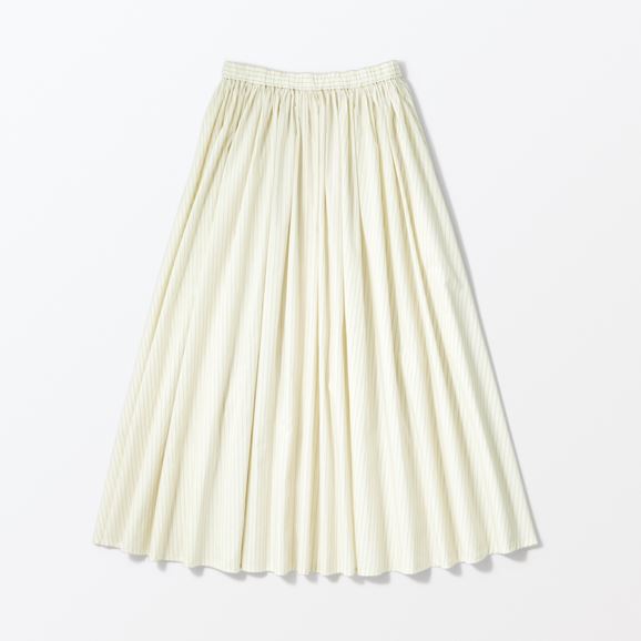 min&#228; perhonen皆川明さん監修のもと、各地の生産現場で生まれた残反や残糸を活かして仕立てたイデーのウェアシリーズ「H& by POOL(ハンド バイ プール)」のスカート。<br>素材に向き合い、生産背景を大切にしながら、生産者とお客さまをつなぐ想いが込められた一着です。生産地で行き場をなくしていた生地を使用し作りました。<br>Off White Stripe:黄色味がかった薄手のシャツ生地。クリーンで上品な表情が魅力です。<br>Gray:綿100%で柔らかくさらりとした肌触りの生地です。<br><dl class="detail_image"><dt><img src="/images/item_page/hand/26ss/gthr_skt01.jpg" alt="" class="detailphoto"/></dt><dd class="detail_txt"><h5>ギャザーの魅力がつまったスカート</h5><p>歩くたびにふわりと揺れて上品な印象を与えます。</p></dd></dl> <dl class="detail_image mt40"><dt><img src="/images/item_page/hand/26ss/gthr_skt02.jpg" alt="" class="detailphoto"/></dt><dd class="detail_txt"><h5>ウエスト紐で楽な着心地</h5><p>ウエスト部分は内側の紐で調整できるので、ウエスト周りがすっきりし、きちんとした印象になります。</p></dd></dl><h5 class="mt20">コーディネートおすすめアイテム</h5><ul class="flex col4"><li><a href="/shop/g/g4550723291194/"><img src="/img/goods/12/4550723291194_org.jpg" alt="H& by POOL Cotton Lib Tshirt Silver Gray" class="detailphoto"><p class="itemName">H& by POOL Cotton Lib Tshirt Silver Gray</p></a></li><li><a href="/shop/g/g4550723207935/"><img src="/img/goods/12/4550723207935_org.jpg" alt="H& by POOL Stand-UP Collar Blouse Off White" class="detailphoto"><p class="itemName">H& by POOL Stand-UP Collar Blouse Off White</p></a></li><li><a href="/shop/g/g4550723291149/"><img src="/img/goods/12/4550723291149_org.jpg" alt=H& by POOL Cotton Knit Shirt Navy" class="detailphoto"><p class="itemName">H& by POOL Cotton Knit Shirt Navy</p></a></li><li><a href="/shop/g/g4550723291125/"><img src="/img/goods/12/4550723291125_org.jpg" alt="H& by POOL Cotton Pullover Knit Red" class="detailphoto"><p class="itemName">H& by POOL Cotton Pullover Knit Red</p></a></li></ul><h5 class="mt20">H& by POOLシリーズの全ラインナップはこちら</h5><a href="/shop/e/eHand/"><img src="/images/item_page_banner/itemPage_bnr_hand.jpg" alt="【特集】H& by POOL" class="itempagebnr"></a>