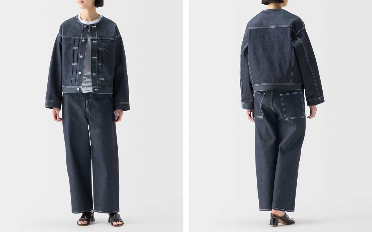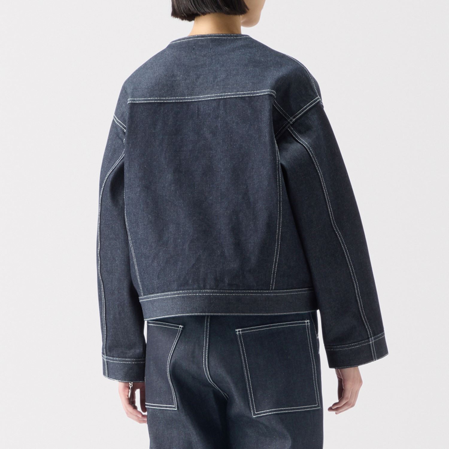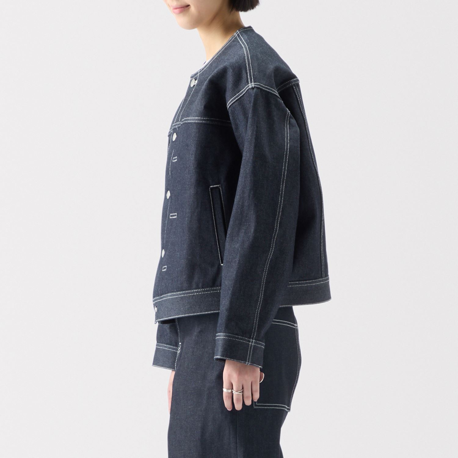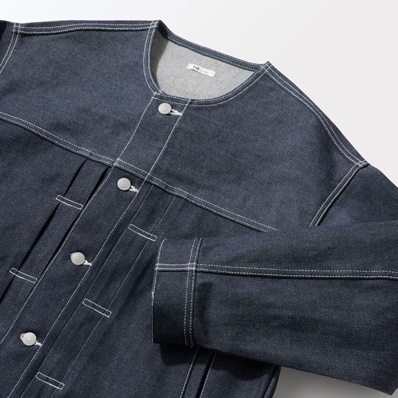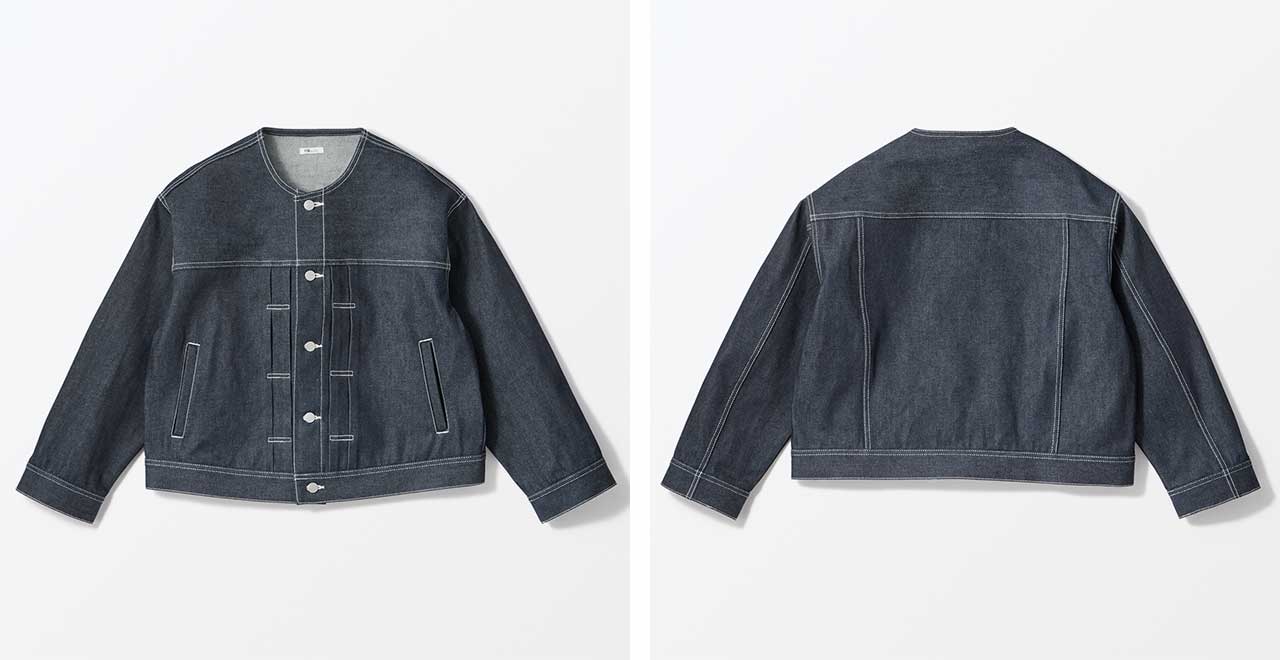 同じノンウォッシュのジーンズと揃えれば一体感が生まれ、インナーやアクセサリーでアクセントを加えることでセットアップスタイルがより一層引き立ちます。 ノーカラーで首元がすっきりしているため、襟付きシャツなどさまざまなアイテムと重ね着が愉しめます。寒い時期はコートとのレイヤードスタイル、着こなしによって幅広い季節で活躍します。