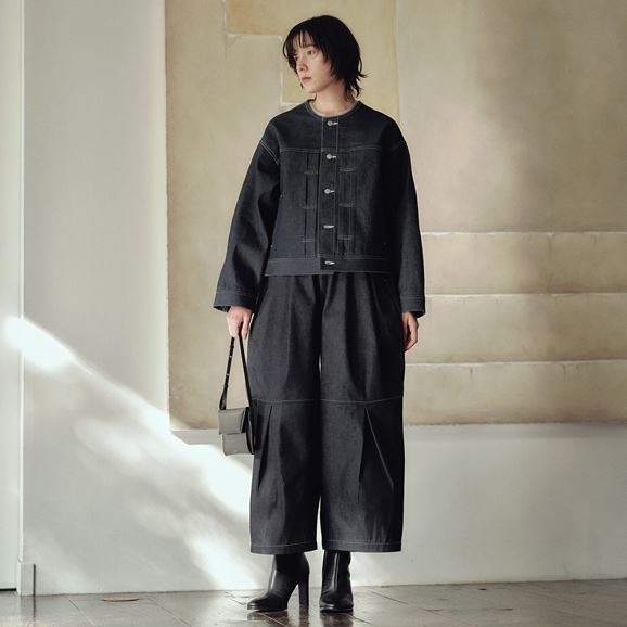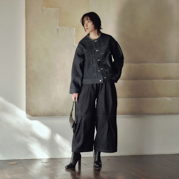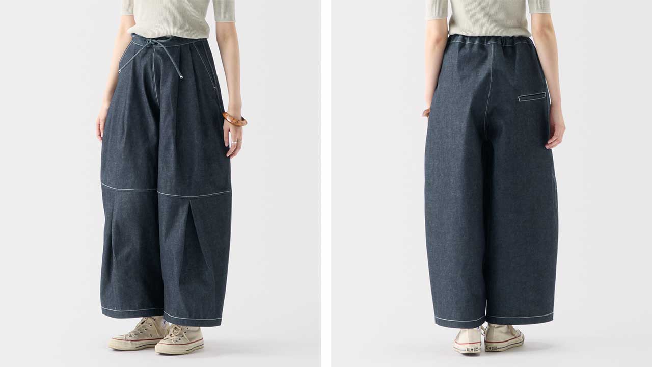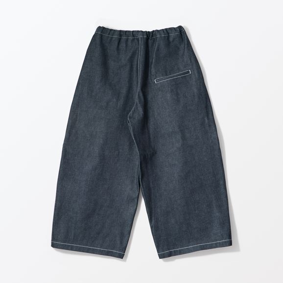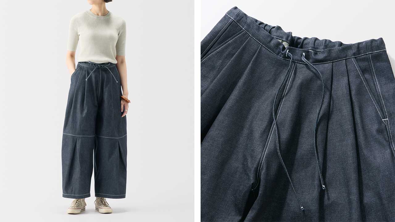 minä perhonen皆川明さん監修のもと、各地の生産現場で生まれた残反や残糸を活かして仕立てたイデーのウェアシリーズ「H& by POOL(ハンド バイ プール)」のデニムワイドパンツ。