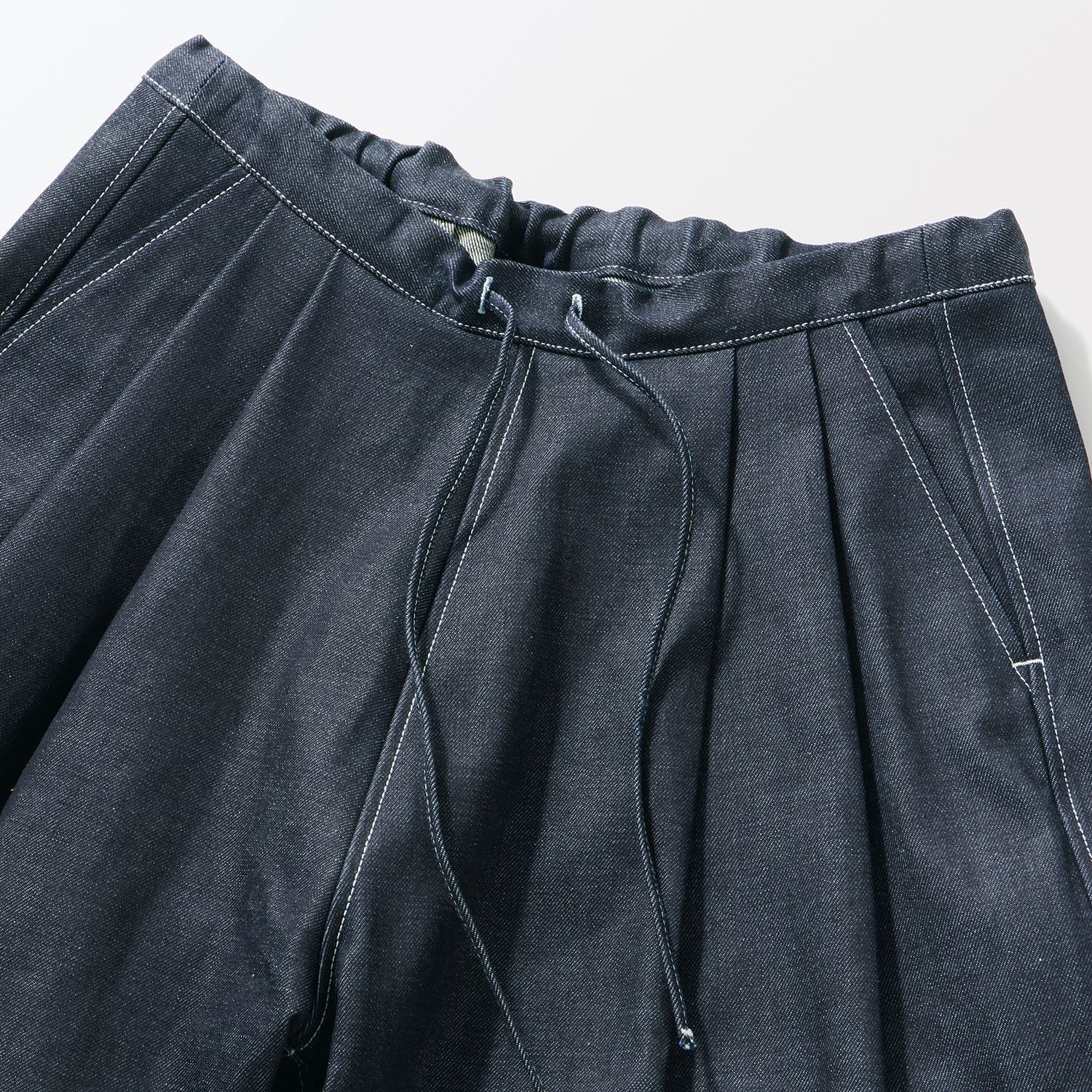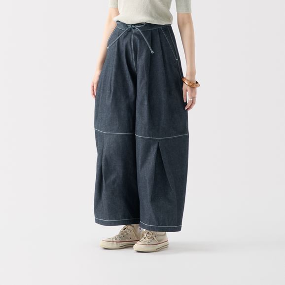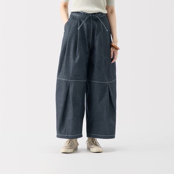 min&#228; perhonen皆川明さん監修のもと、各地の生産現場で生まれた残反や残糸を活かして仕立てたイデーのウェアシリーズ「H& by POOL(ハンド バイ プール)」のデニムワイドパンツ。<br>素材に向き合い、生産背景を大切にしながら、生産者とお客さまをつなぐ想いが込められた一着です。生産地で行き場をなくしていた生地を使用し作りました。<br>デニムの産地として有名な岡山県児島市で織られたデニム生地を使用しています。<br>Non Wash:しっかりとした張りと濃い色合いが魅力。着るほどに色が落ちて味わい深くなり経年変化も愉しめます。<br>Light Blue:しっかりとした生地ですが着るほどに身体になじみます。<br><dl class="detail_image"><dt><img src="/images/item_page/hand/26ss/dnm_wd_pt01.jpg" alt="" class="detailphoto"/></dt><dd class="detail_txt"><h5>きちんと見え、楽な着心地</h5><p>ウエスト部分は紐で調整でき、背面にはゴムが入っているためストレスフリーな着心地です。結んだ紐がほどよいアクセントになります。</p></dd></dl> <dl class="detail_image mt40"><dt><img src="/images/item_page/hand/26ss/dnm_wd_pt02.jpg" alt="" class="detailphoto"/></dt><dd class="detail_txt"><h5>タックを効かせた技ありワイドパンツ</h5><p>膝部分から大きく入ったタックがポイント。立体感のあるシルエットで、動くたびに豊かな表情が生まれます。</p></dd></dl><h5 class="mt20">コーディネートおすすめアイテム</h5><ul class="flex col4"><li><a href="/shop/g/g4550723250597/"><img src="/img/goods/12/4550723250597_org.jpg" alt="H& by POOL No Collar Denim Jacket Indigo Assort Non Wash" class="detailphoto"><p class="itemName">H& by POOL No Collar Denim Jacket Indigo Assort Non Wash</p></a></li><li><a href="/shop/g/g4550723291217/"><img src="/img/goods/12/4550723291217_org.jpg" alt="H& by POOL Cotton Lib Longsleeve Black" class="detailphoto"><p class="itemName">H& by POOL Cotton Lib Longsleeve Black</p></a></li><li><a href="/shop/g/g4550723291194/"><img src="/img/goods/12/4550723291194_org.jpg" alt=H& by POOL Cotton Lib Tshirt Silver Gray" class="detailphoto"><p class="itemName">H& by POOL Cotton Lib Tshirt Silver Gray</p></a></li><li><a href="/shop/g/g4550723207966/"><img src="/img/goods/12/4550723207966_org.jpg" alt="H& by POOL Long Wide Shirt Black Gingham" class="detailphoto"><p class="itemName">H& by POOL Long Wide Shirt Black Gingham</p></a></li></ul><h5 class="mt20">H& by POOLシリーズの全ラインナップはこちら</h5><a href="/shop/e/eHand/"><img src="/images/item_page_banner/itemPage_bnr_hand.jpg" alt="【特集】H& by POOL" class="itempagebnr"></a>