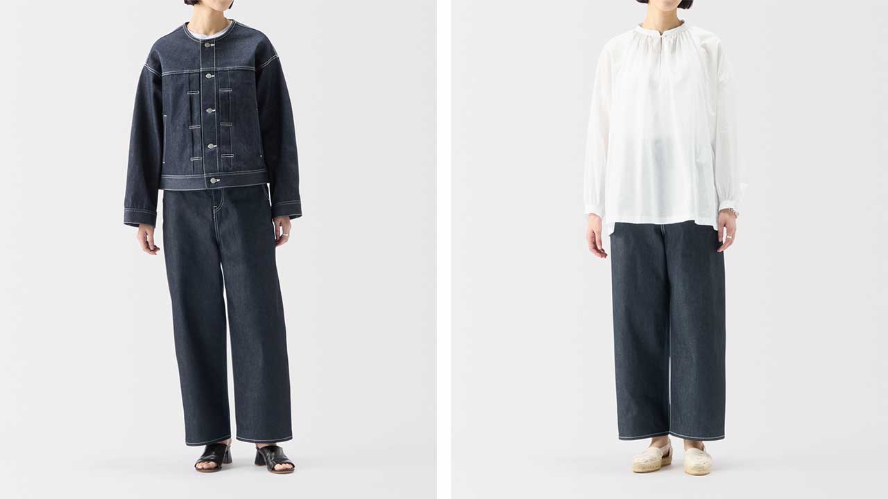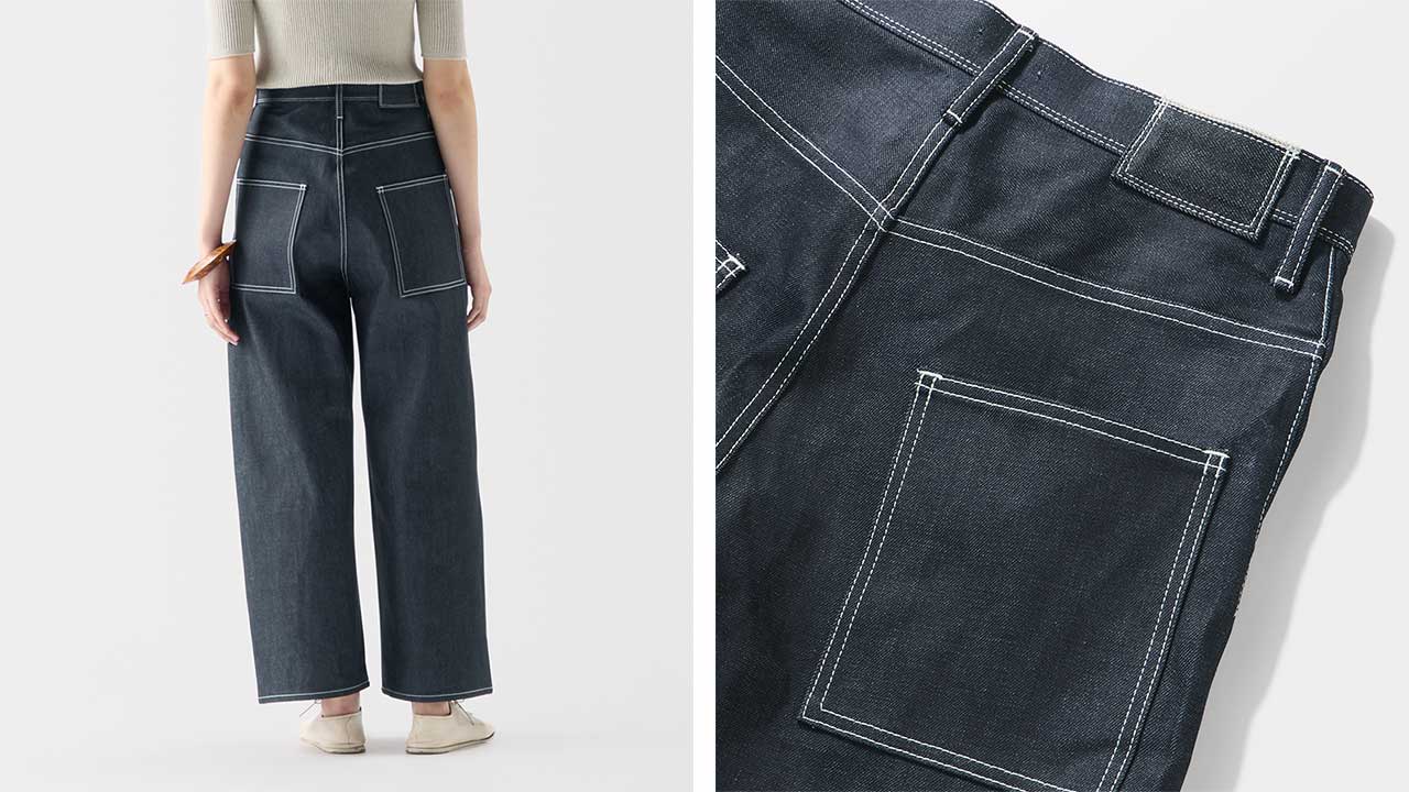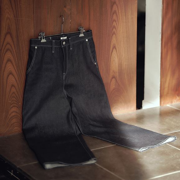 minä perhonen皆川明さん監修のもと、各地の生産現場で生まれた残反や残糸を活かして仕立てたイデーのウェアシリーズ「H& by POOL(ハンド バイ プール)」のデニムパンツ。