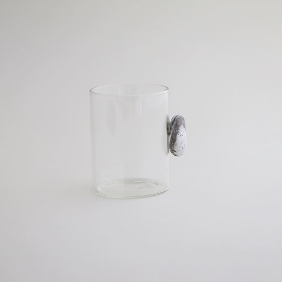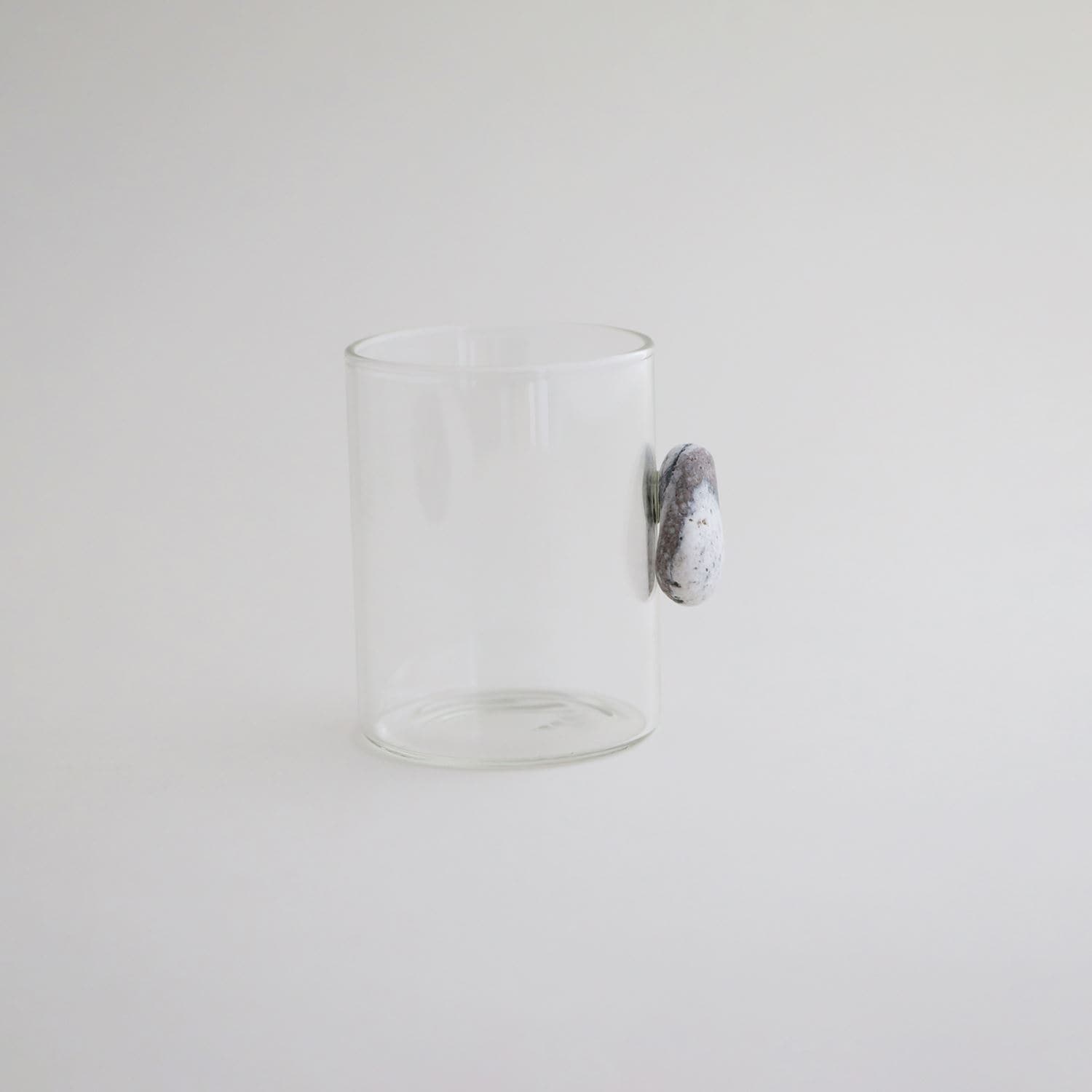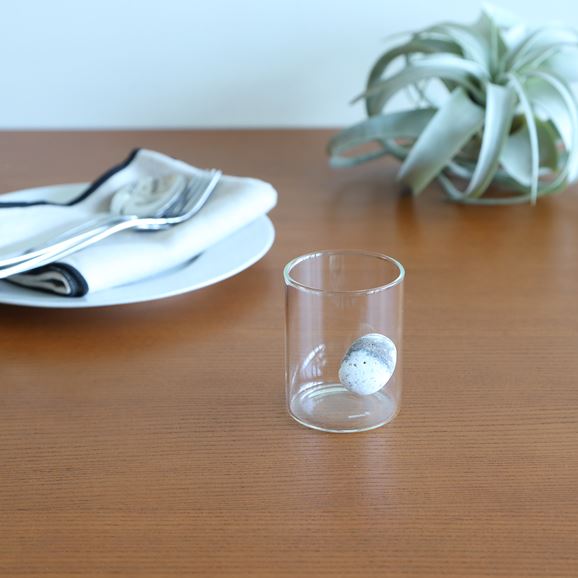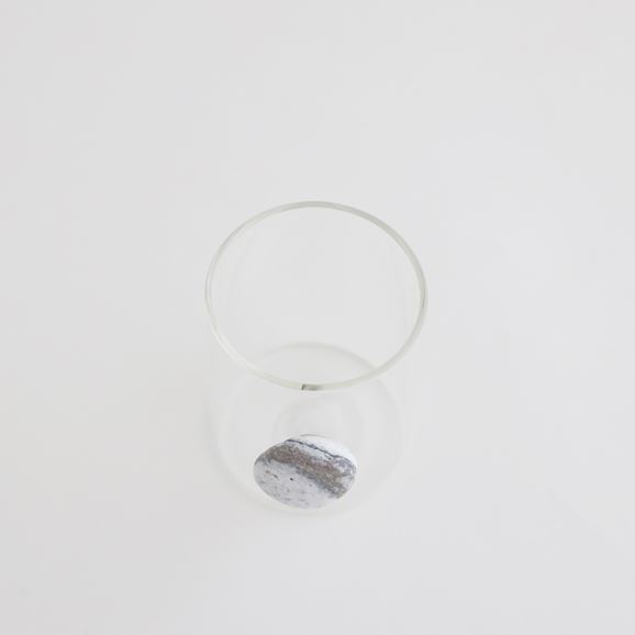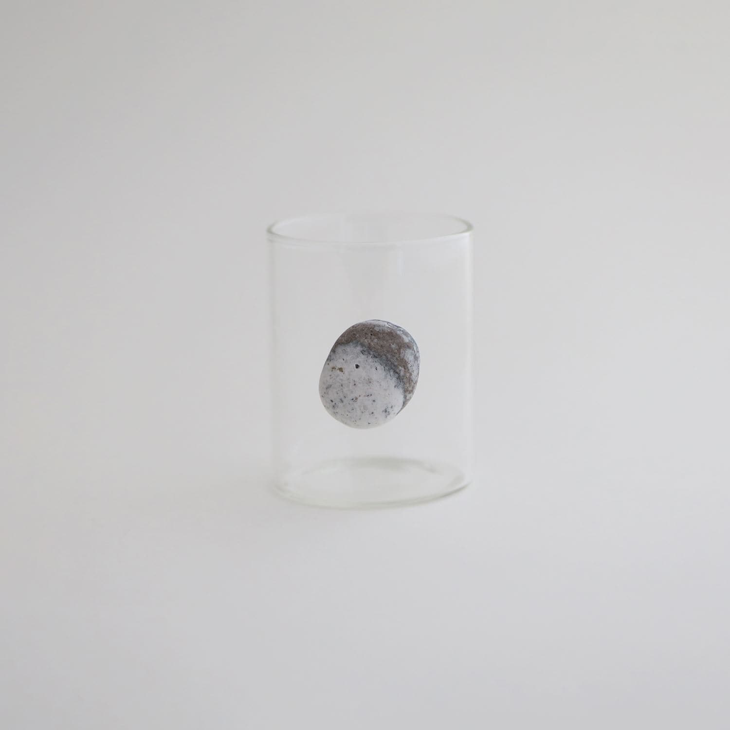 visionガラスのコップに、小さな石を取り付けられた"floating stone"。まるで浮いているかのような石の見え方です。