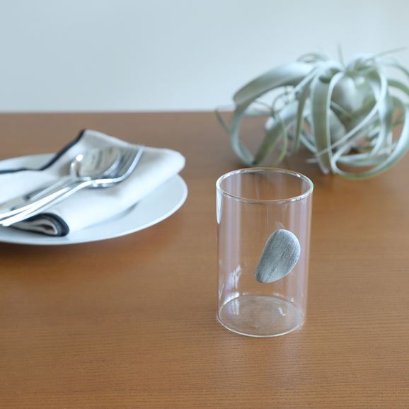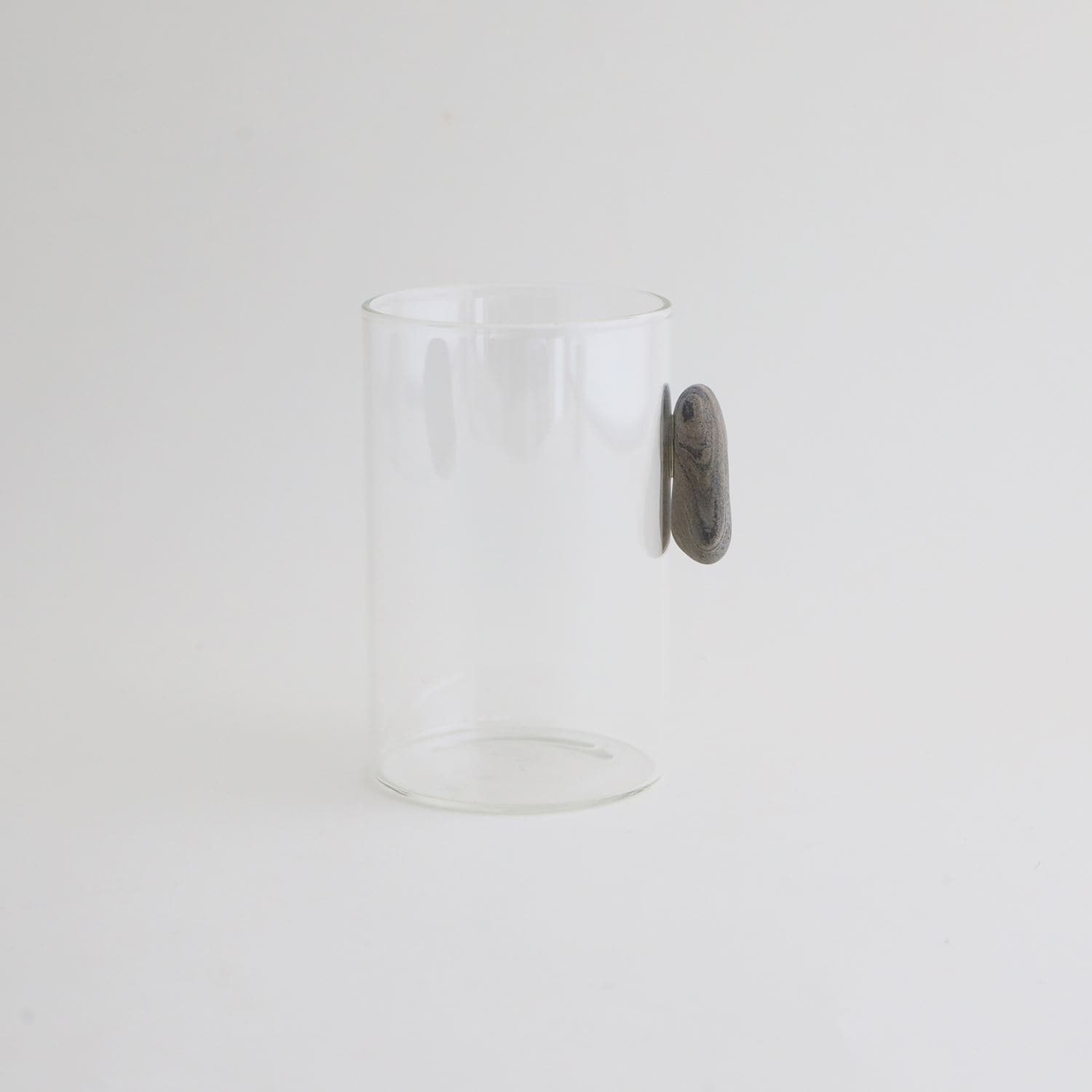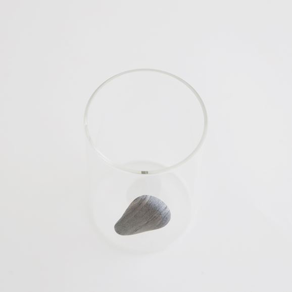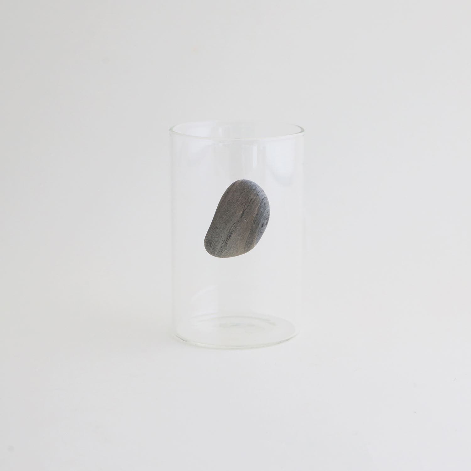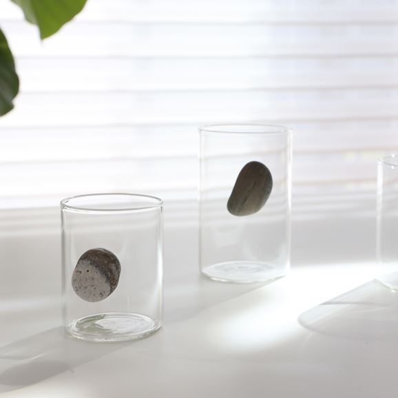 visionガラスのコップに、小さな石を取り付けられた"floating stone"。まるで浮いているかのような石の見え方です。