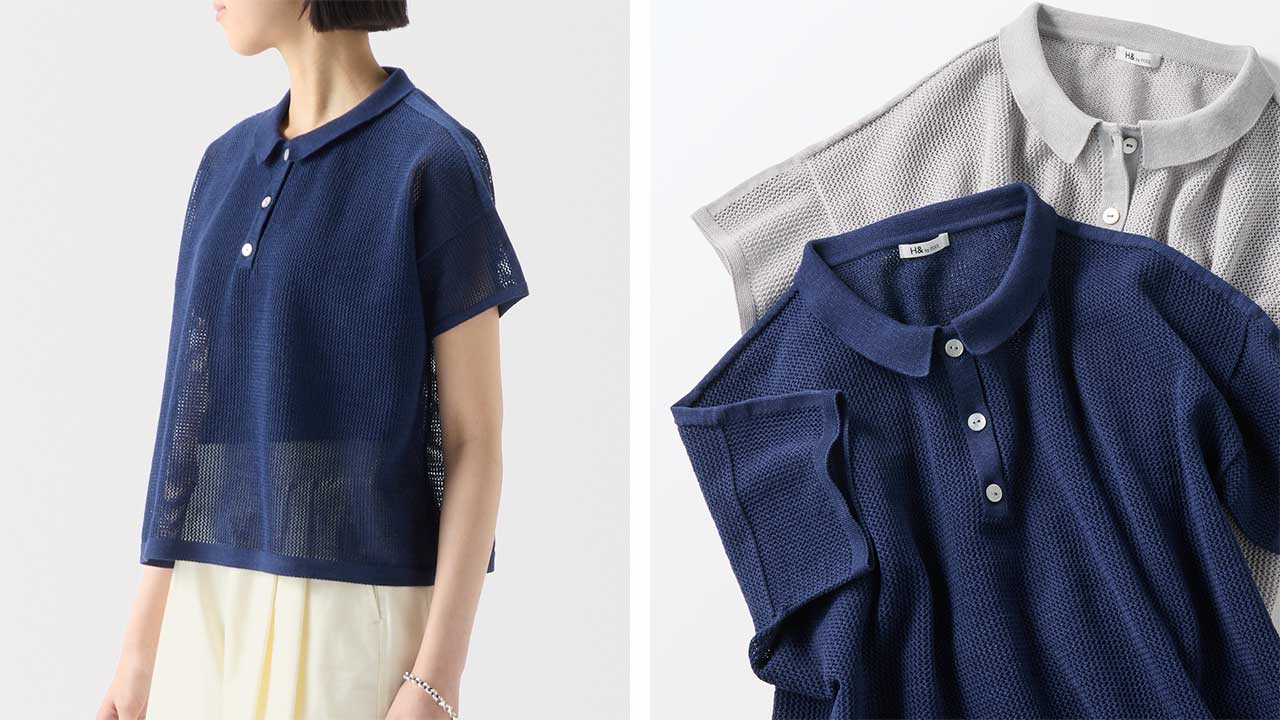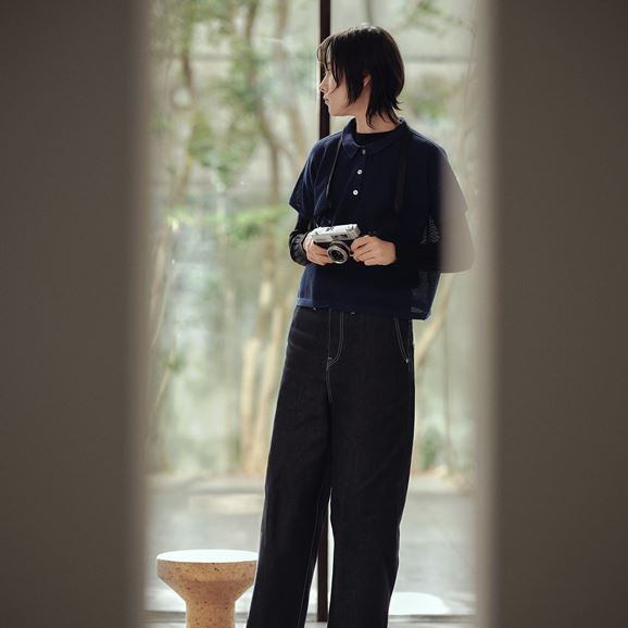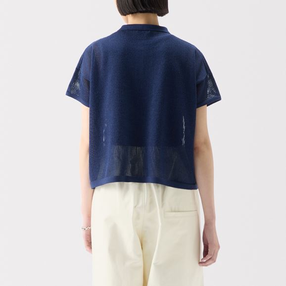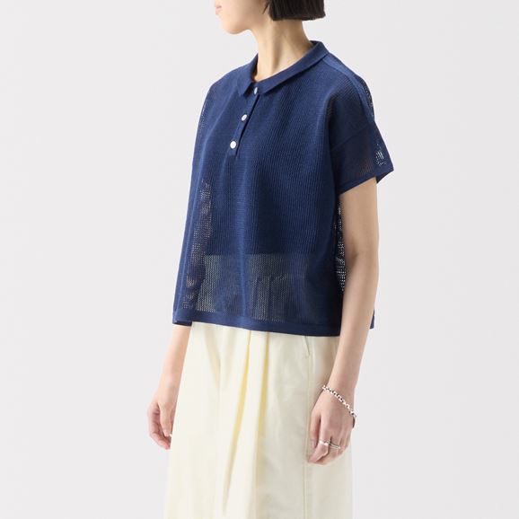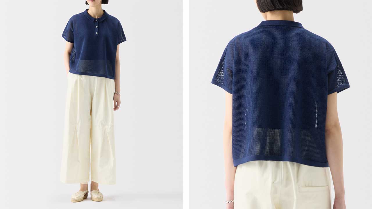 紙を含んだ糸を使用しているため軽さと吸湿速乾性が魅力。ざっくりした編地で風通し良く快適な着心地です。