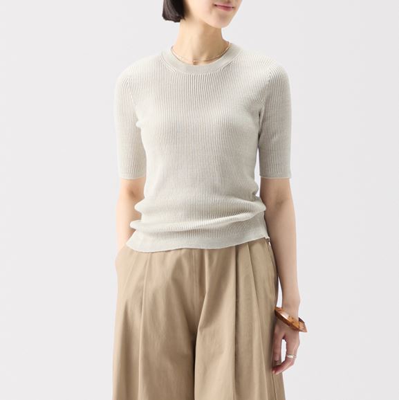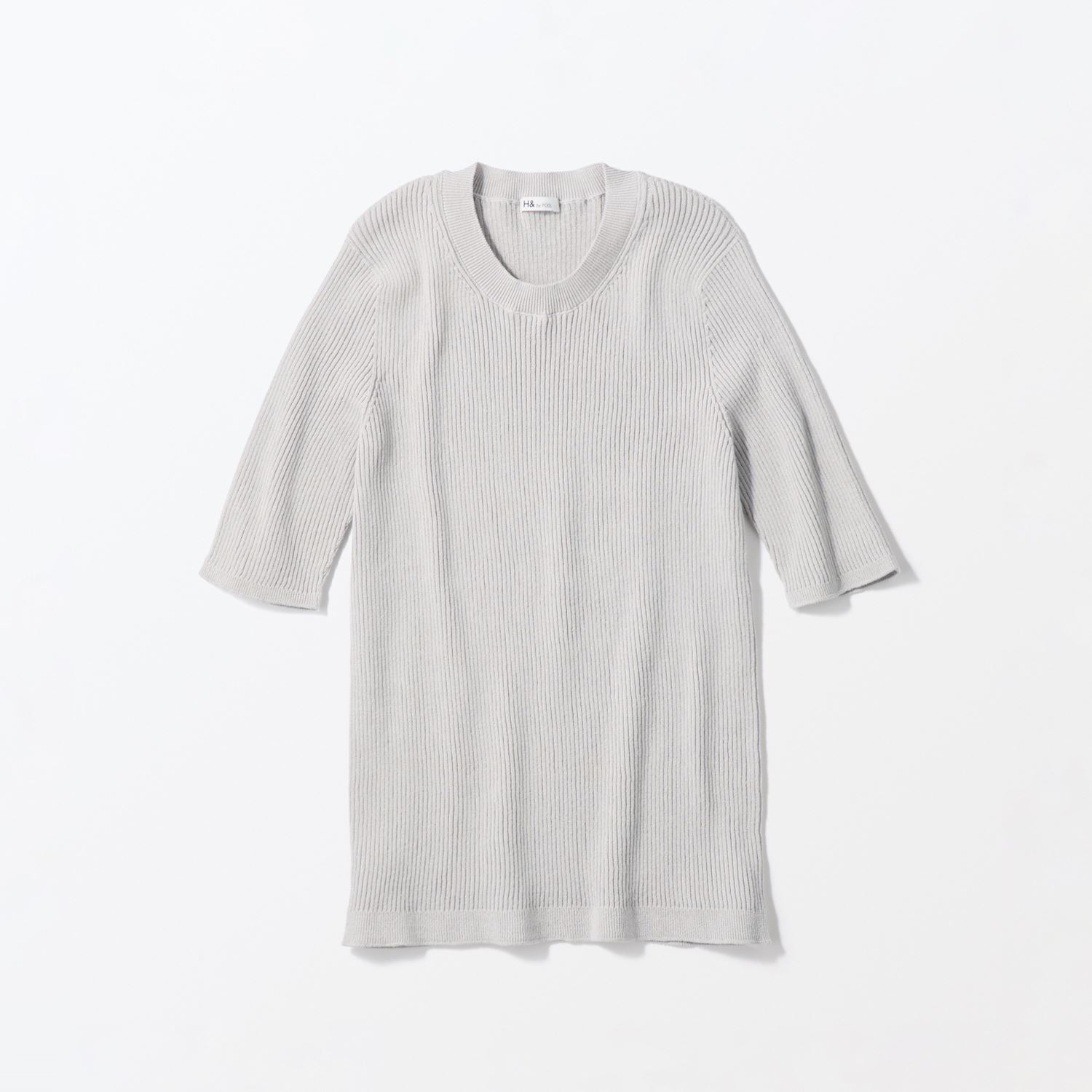 minä perhonen皆川明さん監修のもと、各地の生産現場で生まれた残反や残糸を活かして仕立てたイデーのウェアシリーズ「H& by POOL(ハンド バイ プール)」のリブニットTシャツ。
