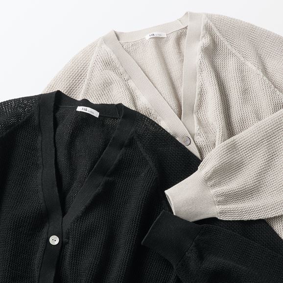minä perhonen皆川明さん監修のもと、各地の生産現場で生まれた残反や残糸を活かして仕立てたイデーのウェアシリーズ「H& by POOL(ハンド バイ プール)」のカーディガン。
