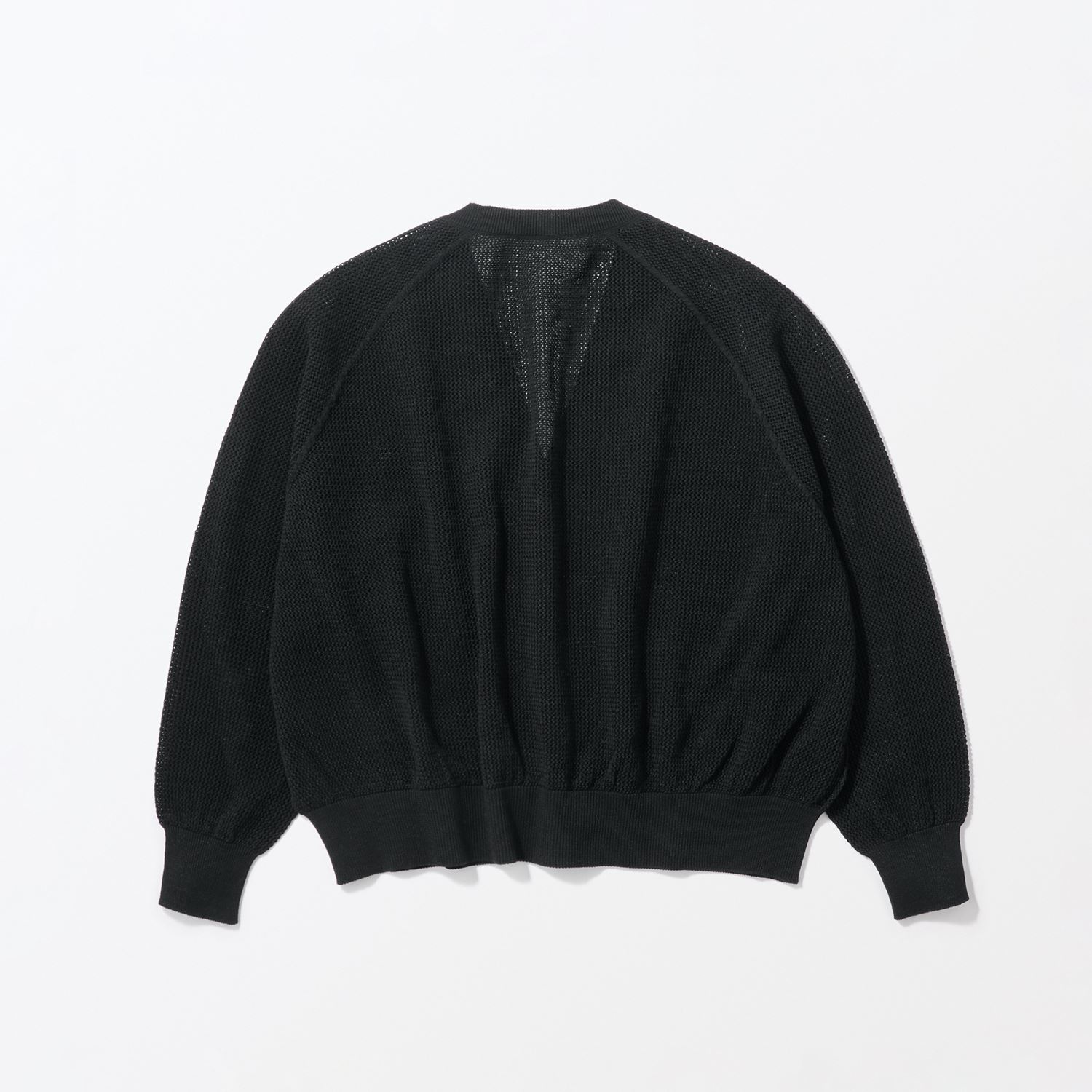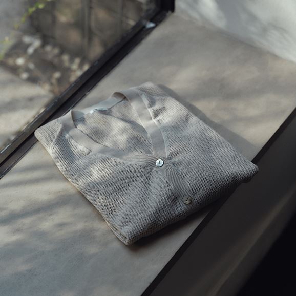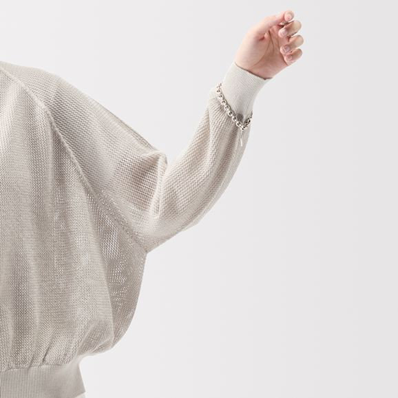 紙を含んだ糸を使用しているため軽さと風通しの良さ、吸湿速乾性が魅力です。ざっくりした編地で、縫い目がないホールガーメント仕上げですっきりとした着心地。