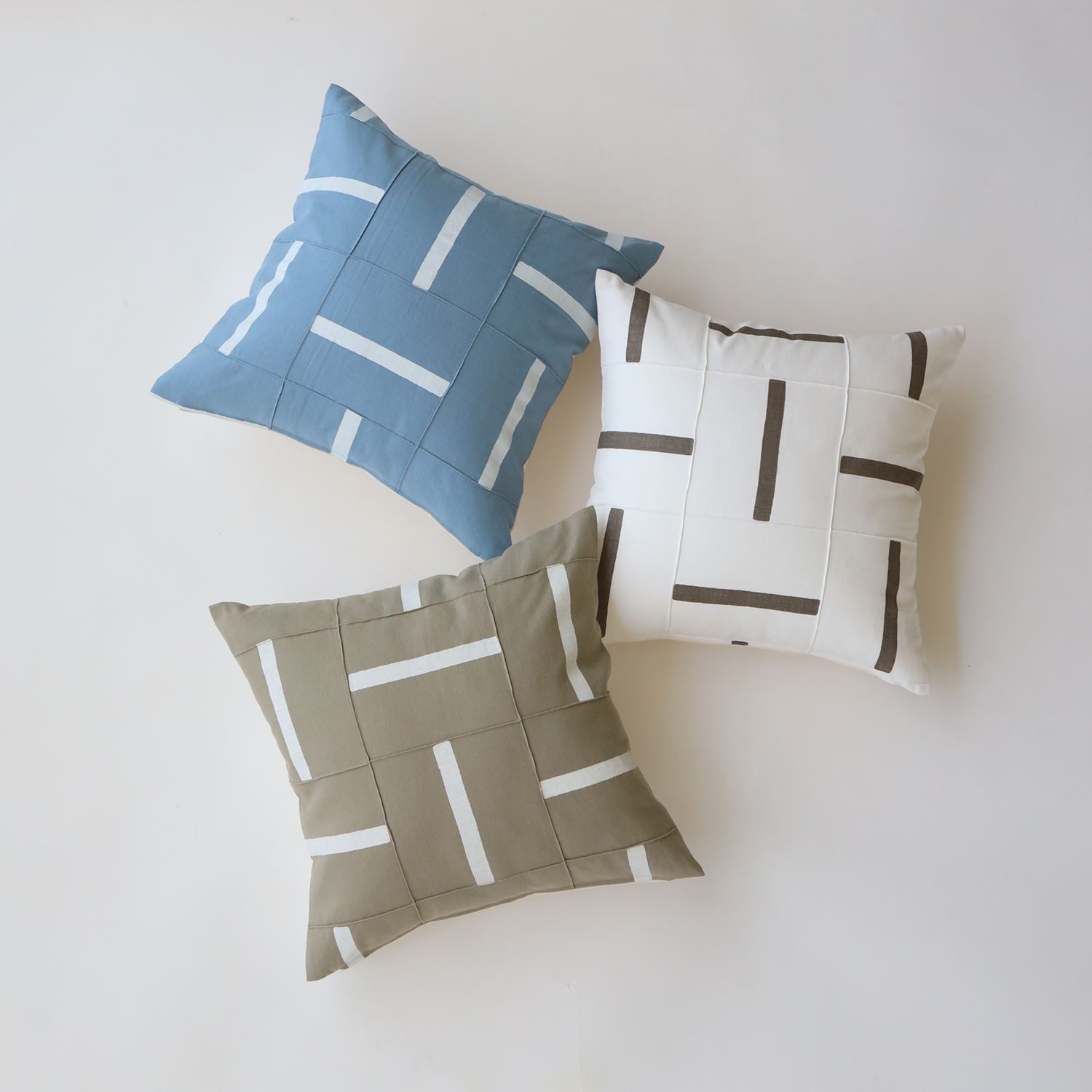 コットン・リネンの素材で織られた後、さらに手作業による2つのステップを経て完成する生地です。まず、モチーフがスクリーンプリントされ、次にステッチでとられたタックにより正方形の文様を作り出します。自然なクラフト調の雰囲気が感じられるファブリックです。