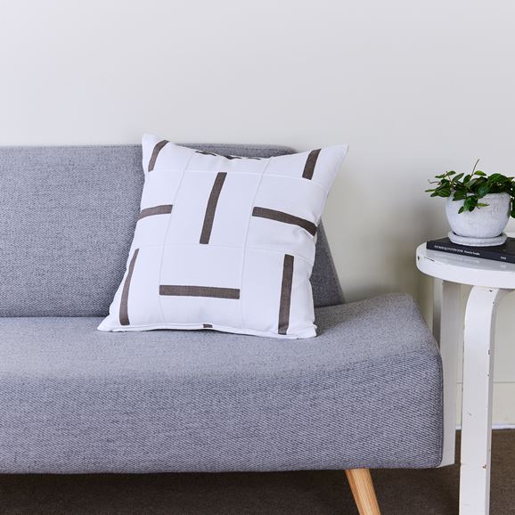 「ZIMMER+ROHDE(チマー&ロード)」の生地を使ったクッションカバー。<br>コットン・リネンの素材で織られた後、さらに手作業による2つのステップを経て完成する生地です。まず、モチーフがスクリーンプリントされ、次にステッチでとられたタックにより正方形の文様を作り出します。自然なクラフト調の雰囲気が感じられるファブリックです。