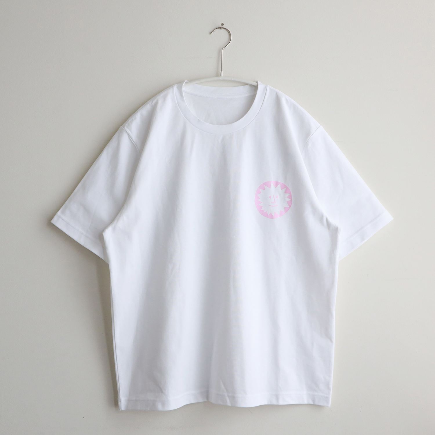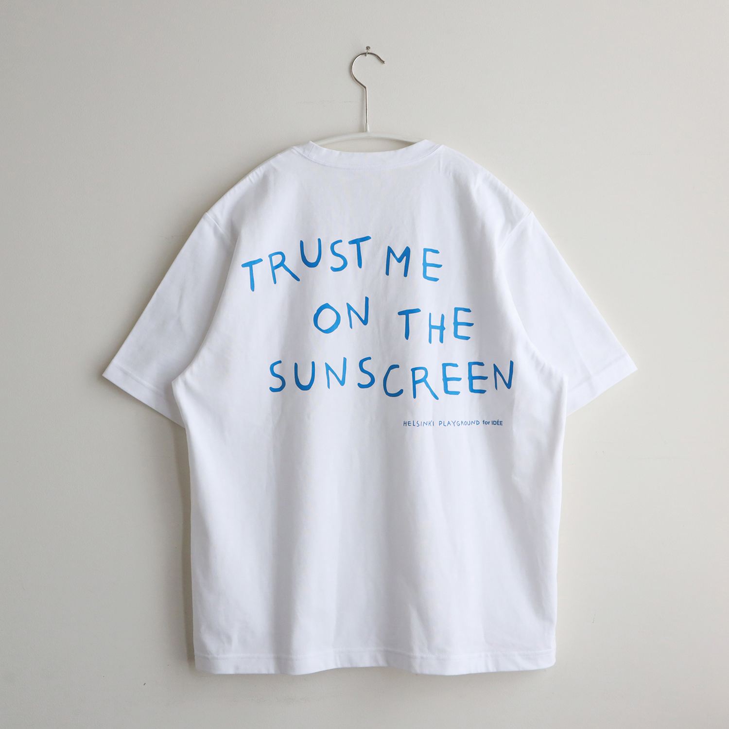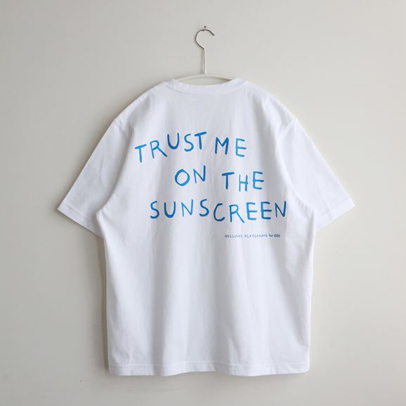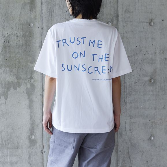 胸元にはHELSINKI PLAYGROUNDの太陽マーク、 背面には「TRUST ME ON THE SUNSCREEN」のグラフィック。シンプルな白Tにメッセージを添えた一枚です。