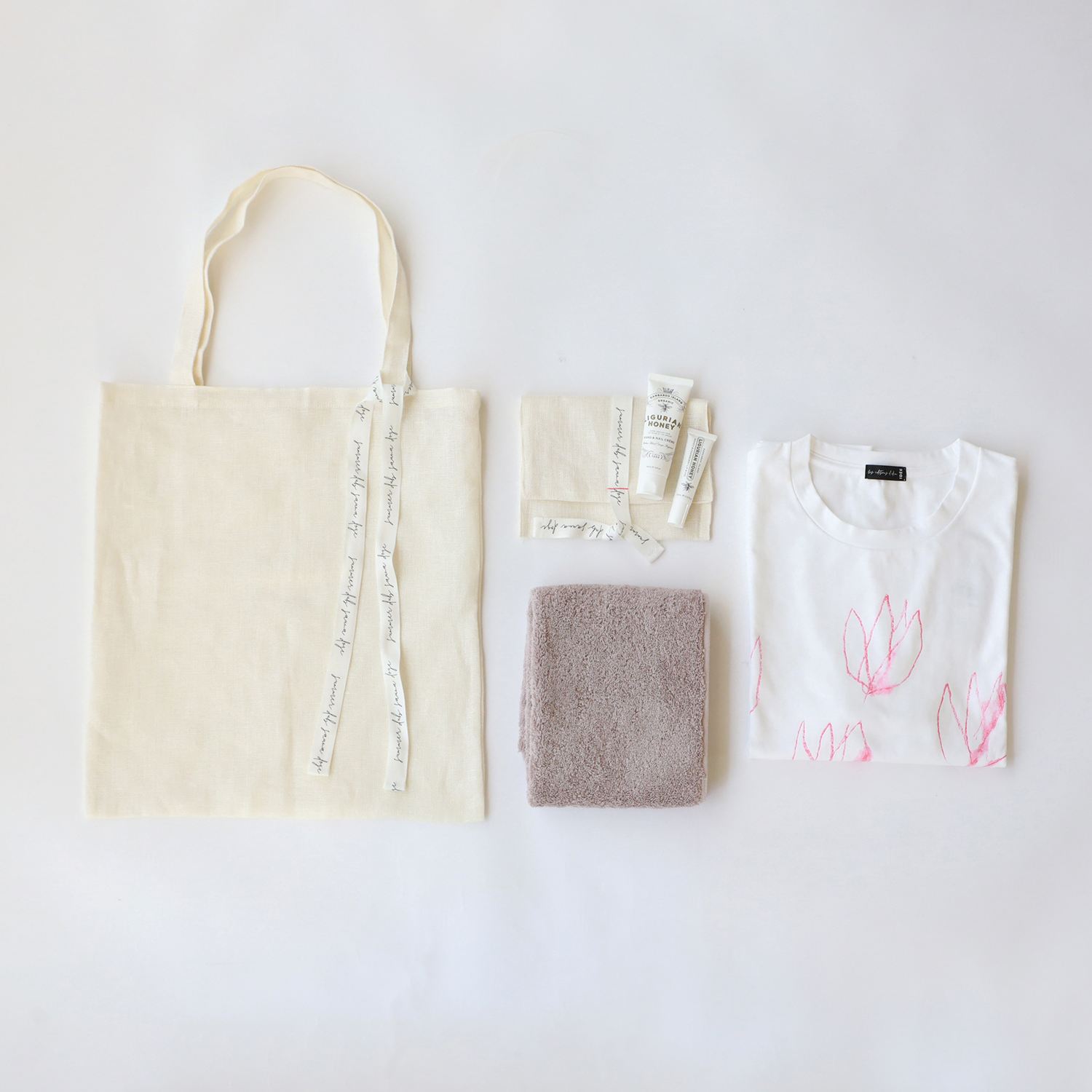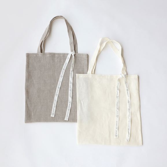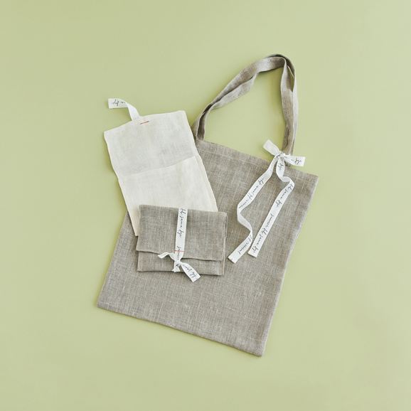 イデーオリジナルのポーチとトートバッグ。涼しげなメッシュのリネン生地が、夏のお出かけにぴったりです。