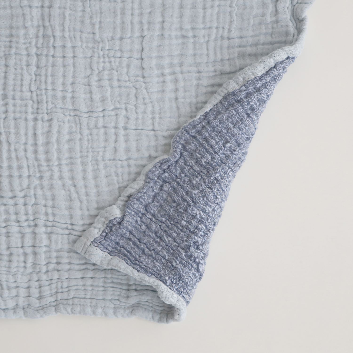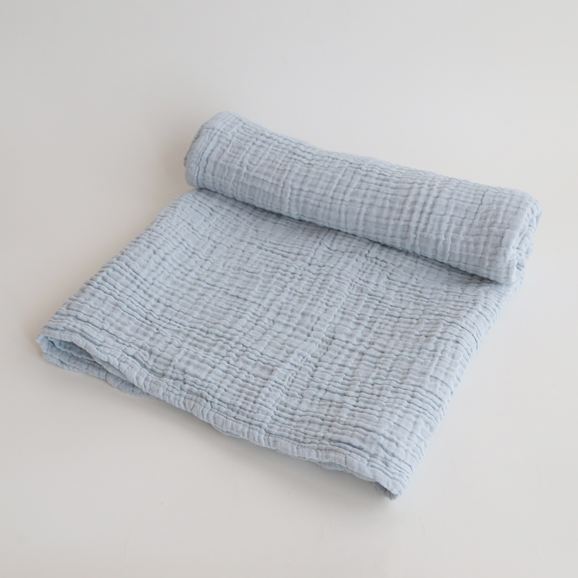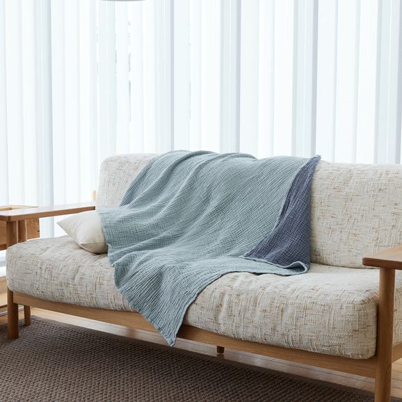 コットン100%のリバーシブルブランケット。柔らかく、まるでまゆに包まれたような優しい肌触りです。程よい厚みでありながら、軽いため持ち運びもしやすく、ひざ掛けやベッドの上に敷いたり、お出かけにも便利。2層になったガーゼの素材は程よく通気性があり、空気を温めてくれるので夏は涼しく、冬は暖かく調湿性があり、オールシーズン使える優れもの。洗うほど柔らかくなり、耐久性があるので長くお使いいただけます。シンプルなデザインは好みを選ばすギフトにも最適です。
