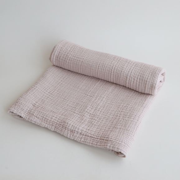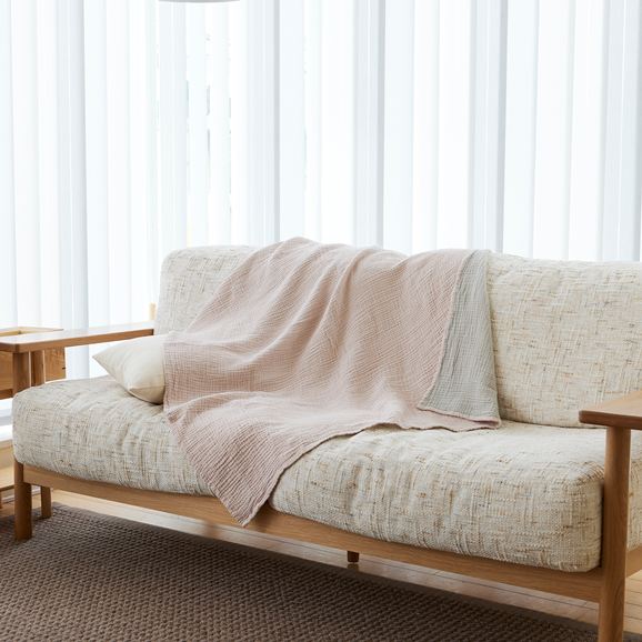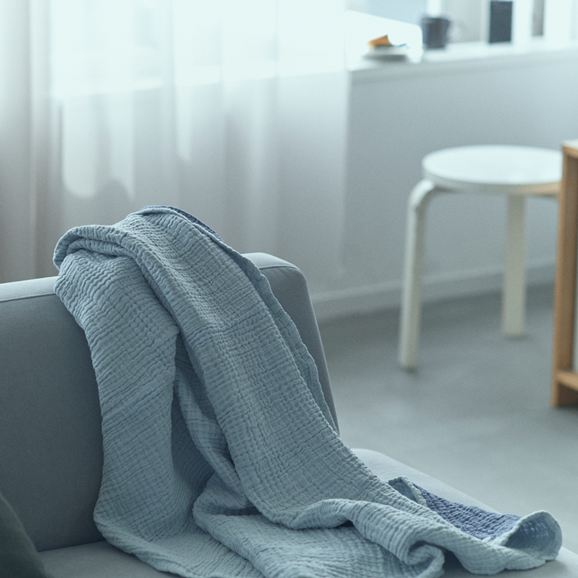 コットン100%のリバーシブルブランケット。柔らかく、まるでまゆに包まれたような優しい肌触りです。程よい厚みでありながら、軽いため持ち運びもしやすく、ひざ掛けやベッドの上に敷いたり、お出かけにも便利。2層になったガーゼの素材は程よく通気性があり、空気を温めてくれるので夏は涼しく、冬は暖かく調湿性があり、オールシーズン使える優れもの。洗うほど柔らかくなり、耐久性があるので長くお使いいただけます。シンプルなデザインは好みを選ばすギフトにも最適です。