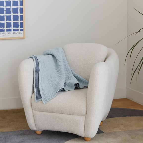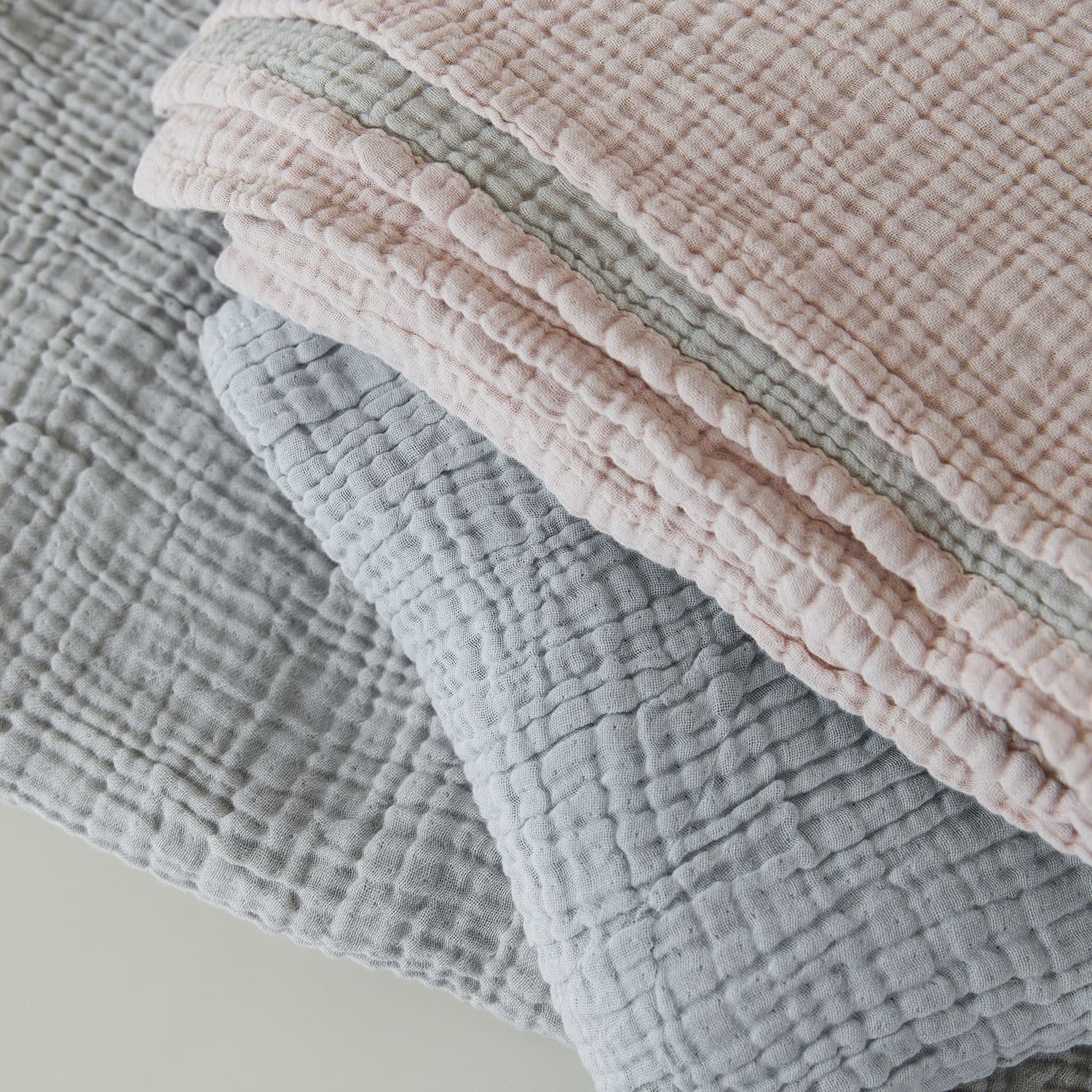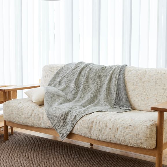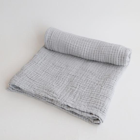 コットン100%のリバーシブルブランケット。柔らかく、まるでまゆに包まれたような優しい肌触りです。程よい厚みでありながら、軽いため持ち運びもしやすく、ひざ掛けやベッドの上に敷いたり、お出かけにも便利。2層になったガーゼの素材は程よく通気性があり、空気を温めてくれるので夏は涼しく、冬は暖かく調湿性があり、オールシーズン使える優れもの。洗うほど柔らかくなり、耐久性があるので長くお使いいただけます。シンプルなデザインは好みを選ばすギフトにも最適です。