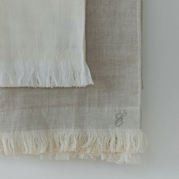 「É」を象ったオリジナルの刺繍が、さりげないアクセントになった上質なリネンコットンガーゼタオル。​ 縦糸にコットン、横糸にリネンを用いた二重ガーゼは、やわらかさとシャリ感をあわせ持つ軽やかな風合い。使うほどに肌になじみ、リネンならではの自然な風合いの変化もお楽しみいただけます。​ さらっとした肌ざわりで乾きも早く、持ち運びにも便利な一枚です。