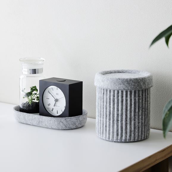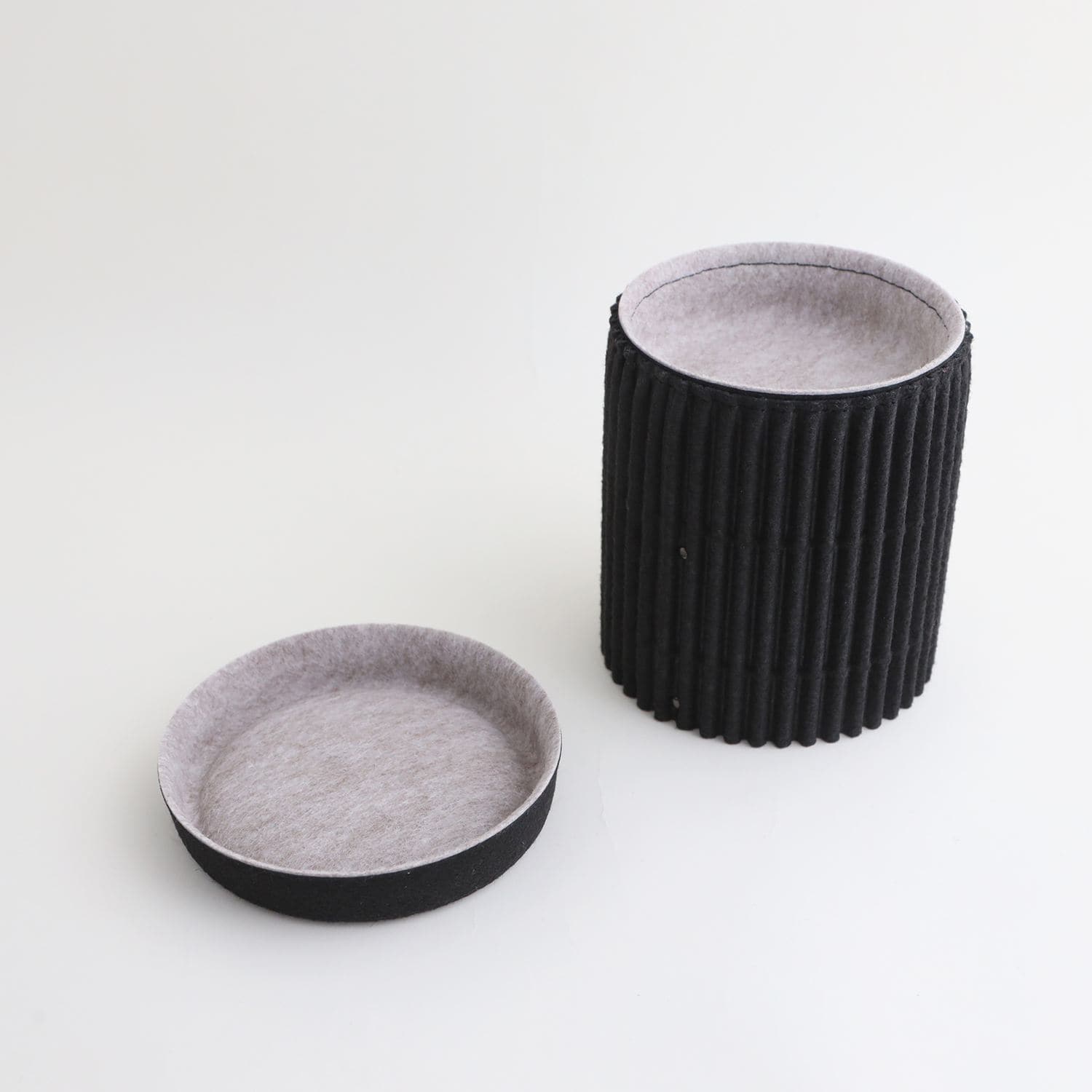 イデーオリジナルの収納アイテム、Saza Series(サザ シリーズ)。さざなみのようなフェルトの凹凸がデザインアクセントのボックスとトレーです。