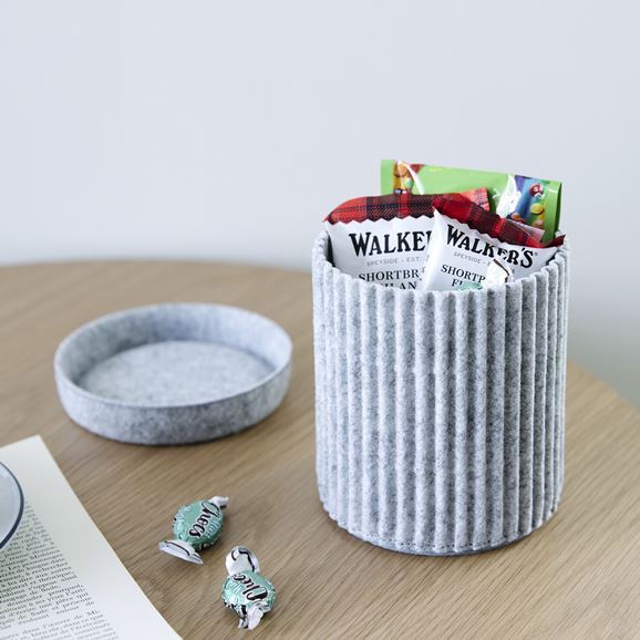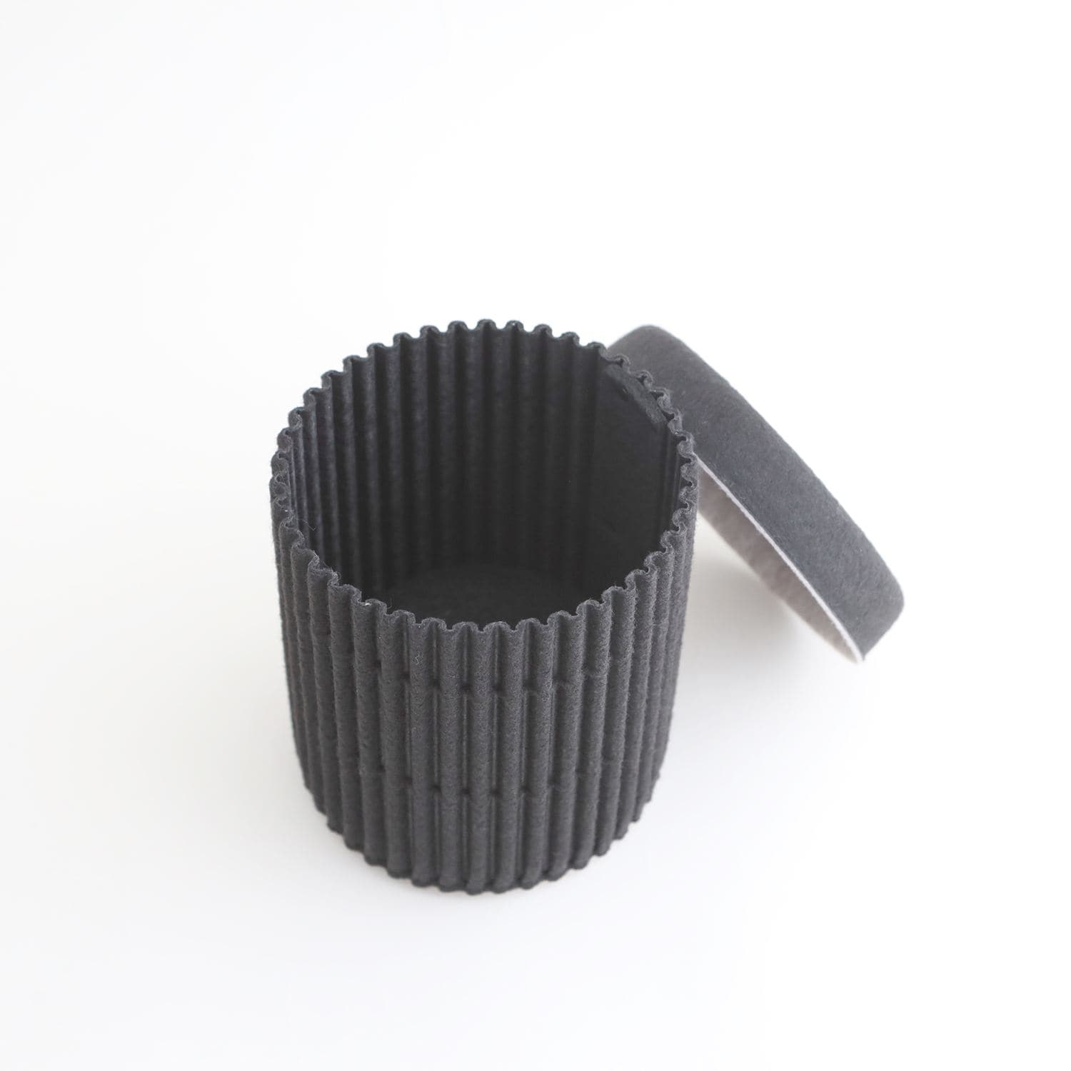 ペットボトルからつくられた再生フェルト素材で、形が崩れにくく安定感があるのに非常に軽く、ほどよいクッション性で、落としても割れないところが、身近な小物を収納するのにぴったり。