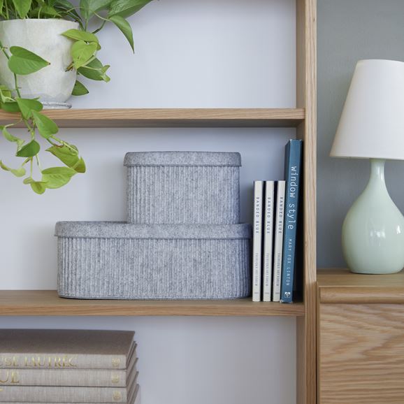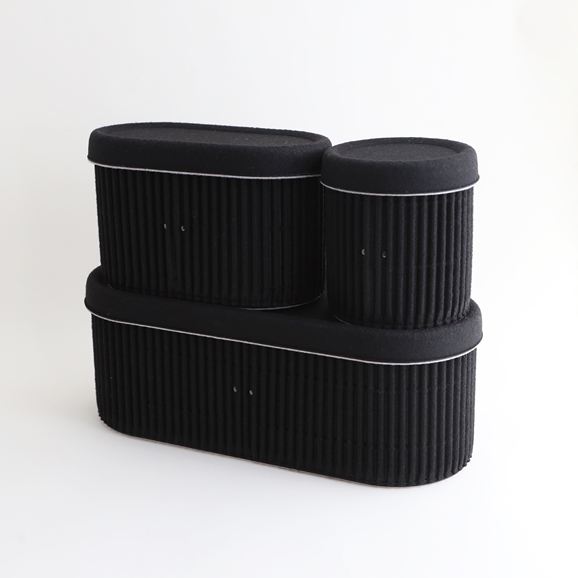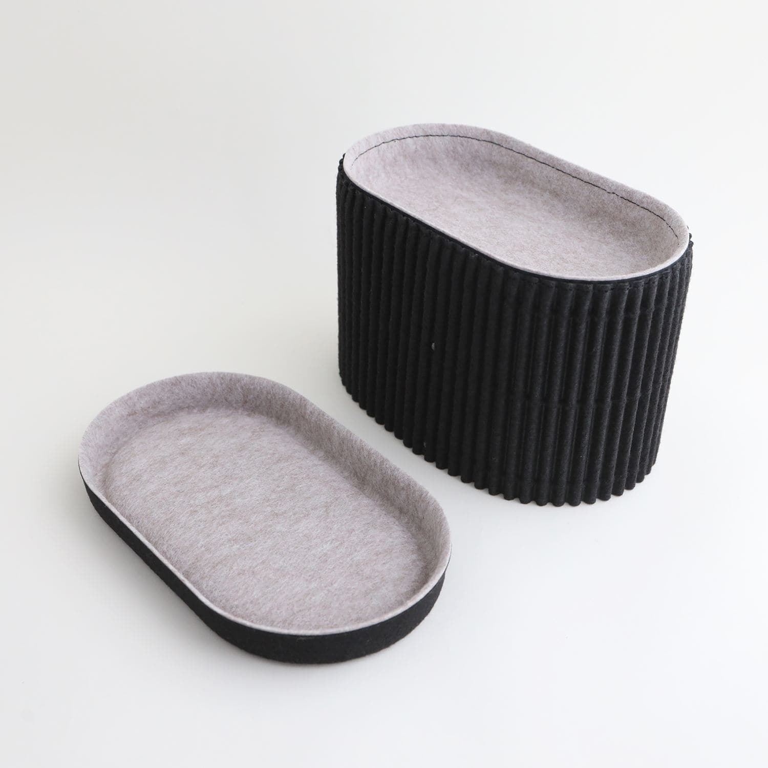 イデーオリジナルの収納アイテム、Saza Series(サザ シリーズ)。さざなみのようなフェルトの凹凸がデザインアクセントのボックスとトレーです。