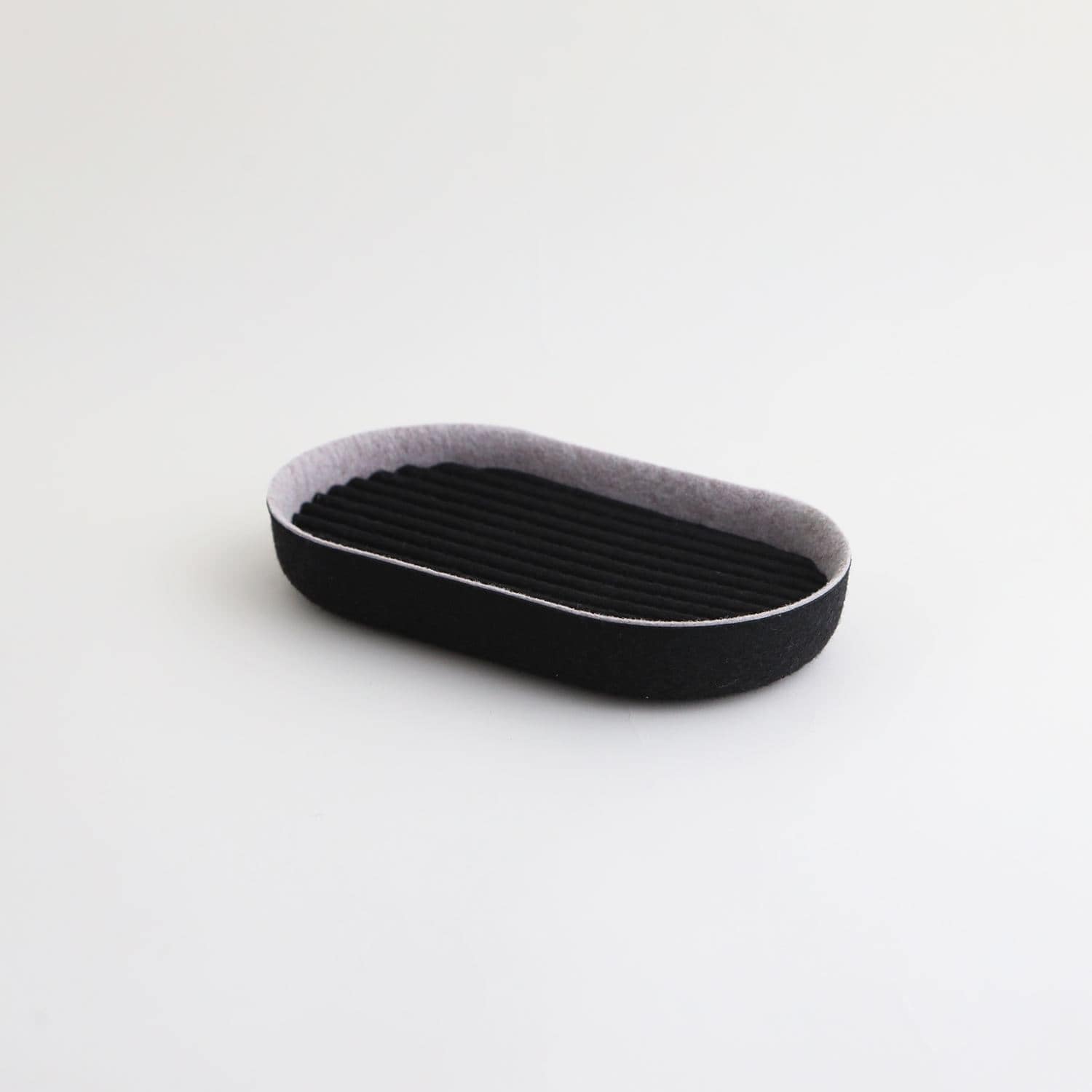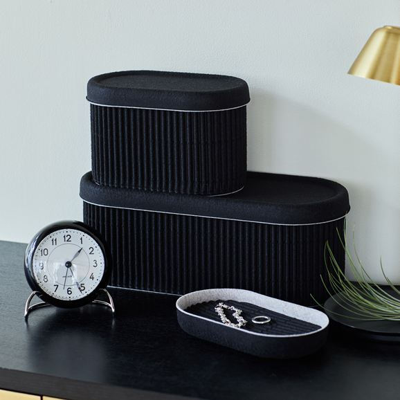 イデーオリジナルの収納アイテム、Saza Series(サザ シリーズ)。さざなみのようなフェルトの凹凸がデザインアクセントのボックスとトレーです。