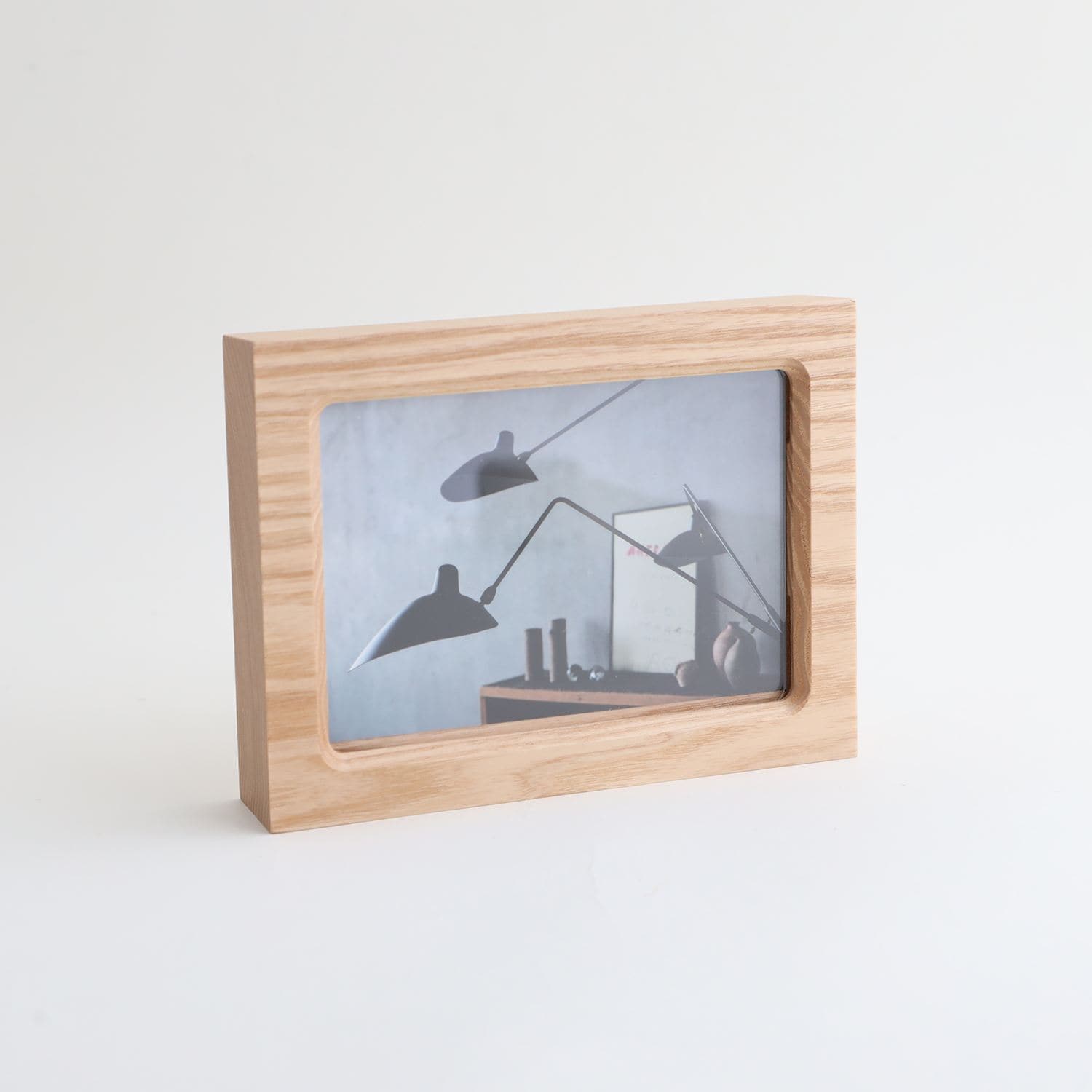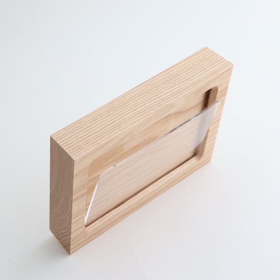 北海道産のタモ無垢材から削り出されたフォトフレームです。どんな場所にも馴染みやすく、収める写真を引き立てます。厚みのある形状は置いた時に安定感があり、縦でも横でも使える仕様になっています。イデーオリジナルのカードが2枚付属するので、すぐにお使いいただけます。
